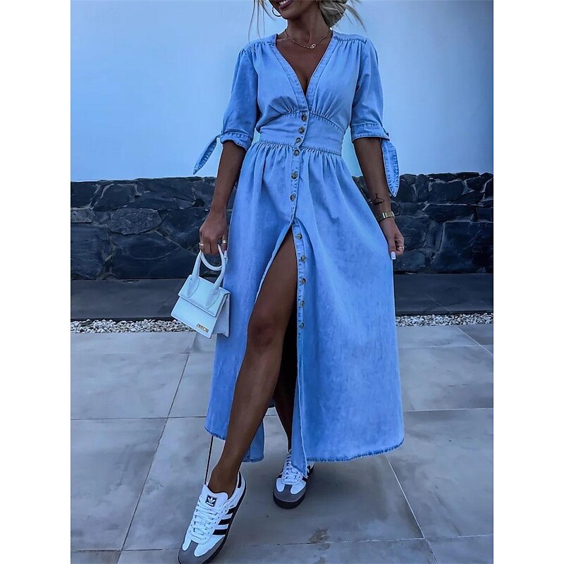 Women's Denim Dress Shirt Dress Maxi long Dress Office Vacation Denim Basic present-day V Neck Button Half Sleeve Summer Spring Regular Fit Plain