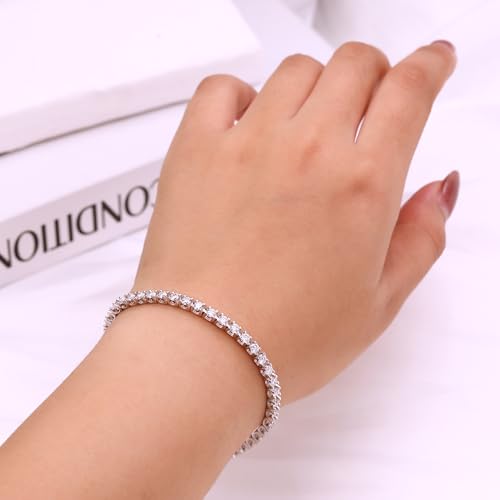 Material: Sterling SilverMetal type: White GoldClasp type: Lobster ClawGem type: Moissanite【Real Moissanite】Bracelets for women are all made of laboratory-made D color VVS1 clarity round brilliant cut moissanite, which blooms with unparalleled brilliance and elegance. The gemstones are cleverly set and are very strong and will not fall off easily.【Fashion Design】Timeless 3mm round moissanite stones are set in a sleek tennis bracelet that is both stylish and durable. Whether it's for daily wear, a party or a wedding, wearing this jewelry for women is sure to make you stand out from the crowd!【Excellence Quality】Silver bracelets for women are made with exquisite craftsmanship and stand the test of time.925 sterling silver with 18K white gold plating, lead-free and nickel-free, won't irritate your skin.【Comfortable To Wear】The moissanite tennis bracelet is designed with a sturdy clasp for confident and easy wearing. We have 6 lengths to choose from: 6 inches, 6.3 inches, 6.7 inches, 7 inches, 7.5 inches and 8 inches, which can easily fit different wrist sizes.【Thoughtful Gift】Our bracelets for women trendy are delivered in a elegant gift box, which can be used to express your love to your wife, fiancée, girlfriend, mother or family on engagement, wedding, Valentine's Day, wedding anniversary or Mother's Day, Christmas, Thanksgiving and other holidays. Perfect for everyday use. premium materials and excellent craftsmanship ensure long-lasting durability.