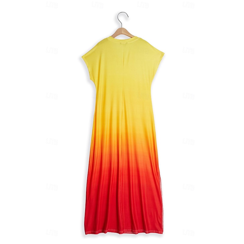 : The dress features a trendy ombre rainbow pattern that transitions beautifully from lively yellow to warm red hues. The modern V-neckline and short sleeves contribute to the dress's casual yet chic look. Notable for its split thigh design, this maxi dress adds a playful touch while maintaining an aura of sophistication.