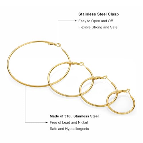14K Gold Plated Stainless Steel Hoop Earrings - Hypoallergenic, Lightweight, 4 Pairs