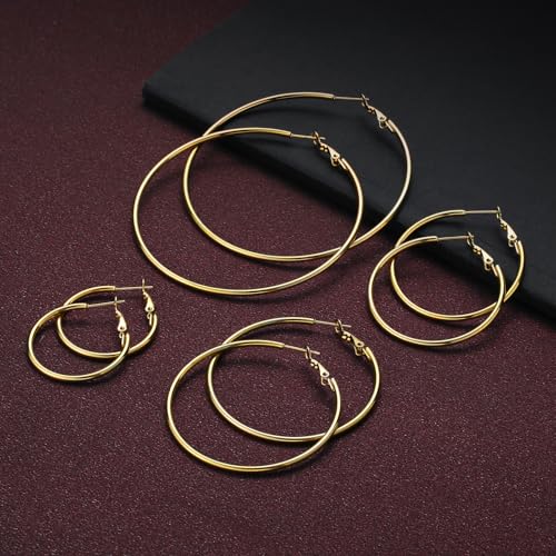 Material: Stainless SteelMetal type: Stainless SteelBack Finding: Clip OnEarring design: HoopMetal weight: 7 gGem type: No Gemstone4 Pairs Gold Hoop Earrings: Each order includes pack of 4 pairs of different size gold hoop earrings for women; (30mm/40mm/50mm60mm)One set can meet your various occasions and wearing needs, enhance your daily fashion decoration color14K Gold Hoops: These gold hoop earrings are 14k gold plated and Hypoallergenic, Nickel and Lead-Free. High polished, can keep a long time color. Don't worry about tarnish or fade over time. These gold hoops will bring you a better wearing experienceLightweight cozy Hoops: These 4 pairs gold earrings are lightweight and comfortable to wear. Stainless steel gold clip on earrings trendy jewelry for womenHypoallergenic Earrings: 14k gold hoop earrings with 925 sterling silver 20 gauge earring post , nickel-free and lead-free hypoallergenic hoop earrings for women's sensitive earsWidely Used Gold Hoops: Gold hoop earrings set for women; Ready for giving, Engagement, Wedding, Anniversary Day, Birthday to your girlfriend, wife, mom, Friend, Valentine's Day or Christmas Day, yourself or someone special Perfect for everyday use. first-class materials and excellent craftsmanship ensure long-lasting durability.
