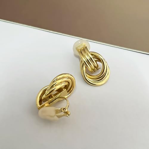 Gold Clip On Earrings for Women Knot Link Trendy Chunky Non Pierced Earring 14K Gold Plated Hoops Drop Dangle Earrings Lightweight Jewelry