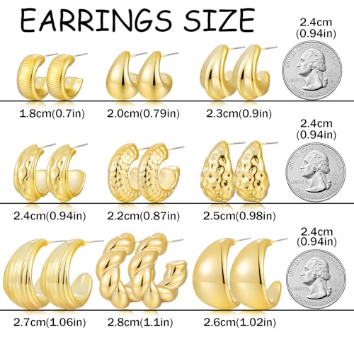 • Gold Hoops: You will receive 9 pairs of gold plated earrings with different shapes and styles. They can be worn alone or stacked with other earrings, creating sense of layering and distinctive style