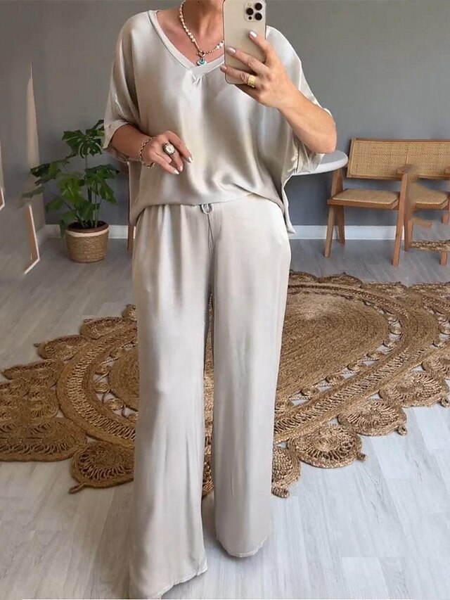 Women's trendy T Shirt Wide Leg Pants 3/4 Length Sleeve V Neck Plain Holiday Weekend Silver Black Pink Summer Regular Fit