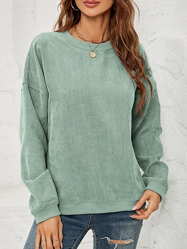 Highlights [Fabric:] Crafted from soft and textured polyester, this Women's Sweatshirt offers a cozy corduroy-like look that is perfect for the cooler fall and winter seasons. The micro-elasticity ensures comfort and a relaxed fit, while maintaining its shape. [Fit:] The sweatshirt features a regular fit with a loose, laid-back vibe, enhanced by the dropped shoulders and retro crew neck. The ribbed cuffs offer a neat and timeless finish, making it a versatile piece for various casual outfits. [Design Highlights:] The design boasts a subtle plain pattern in a soothing sage green, adding a touch of understated elegance to your wardrobe. Its simplicity allows it to pair effortlessly with jeans or leggings for a fashionable yet comfortable ensemble. [Occasions:] Ideal for daily wear, whether you're heading out for a relaxed outing or enjoying a cozy day indoors. Its casual style is perfect for both streetwear and leisure activities, making it a staple for your fall and winter wardrobe. [Size Notice:] Available in a range of sizes from S to XL, this sweatshirt is designed to cater to various body types, ensuring a comfortable fit for everyone.