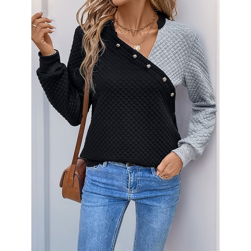 Women's Texture Sweatshirt Waffle Sweatshirt Pullover Plain V Neck Buttons Long Sleeve Black Spring Fall