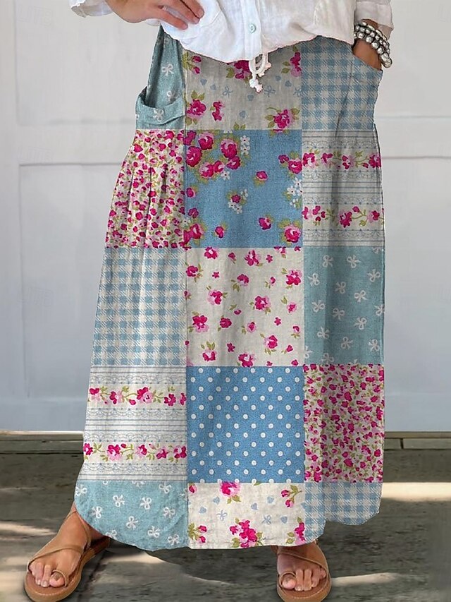 More information about Women's Skirt A Line Bohemia Vintage Casual Maxi High Waist Skirts Floral Pocket Print Micro-elastic Street Daily Navy Blue Blue Sky Blue Brown Summer Polyester Faux Linen