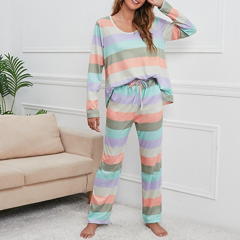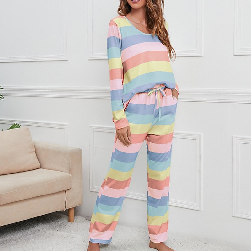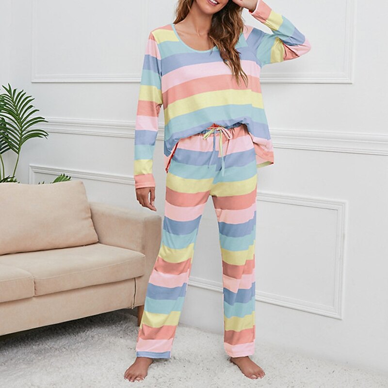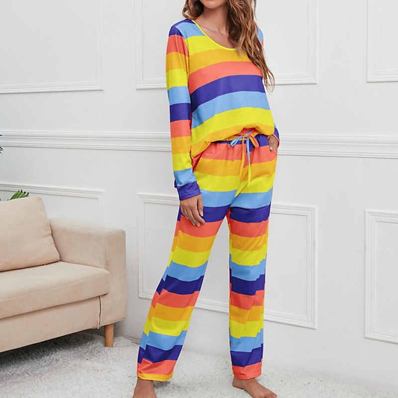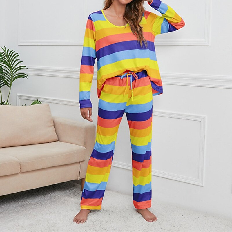 More information about Women's Pajamas Nighty Pjs Sets 2 Pieces Rainbow Stripe Fashion Comfort velvety Home Daily Bed Cotton Breathable V Wire Long Sleeve T shirt Tee Pant Spring Fall Home Outfits
