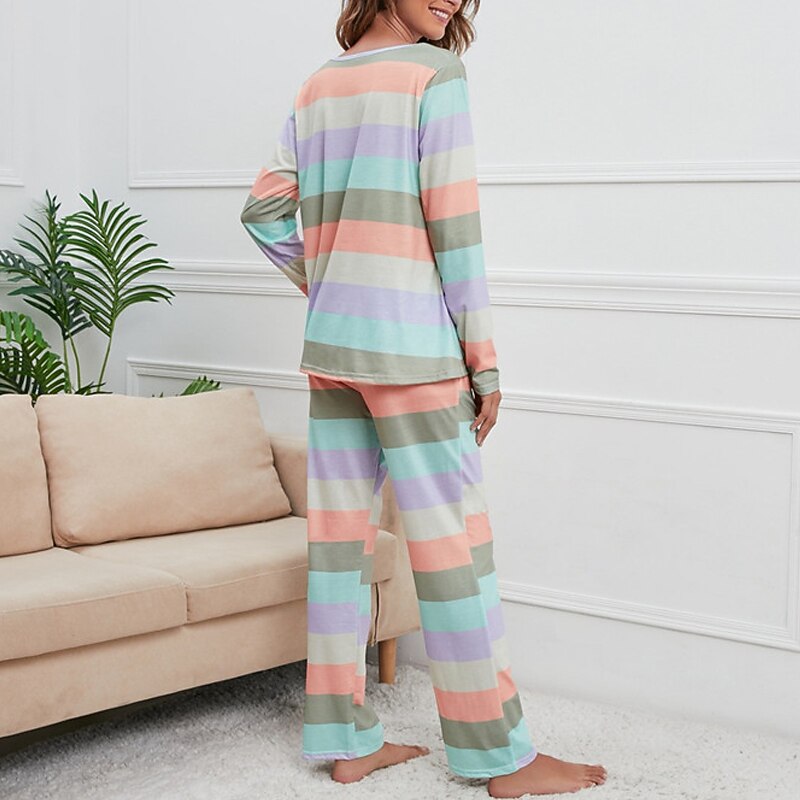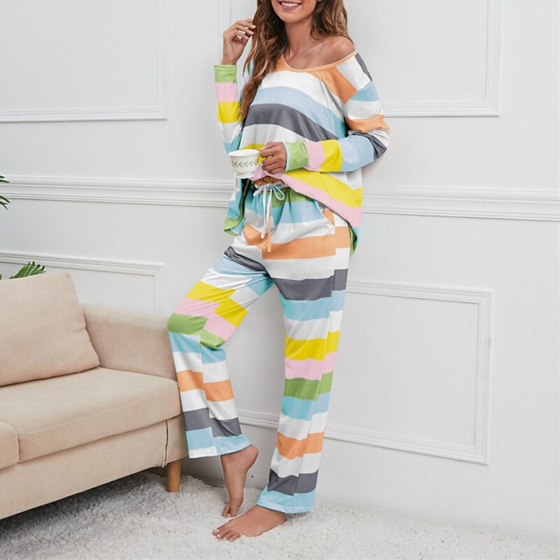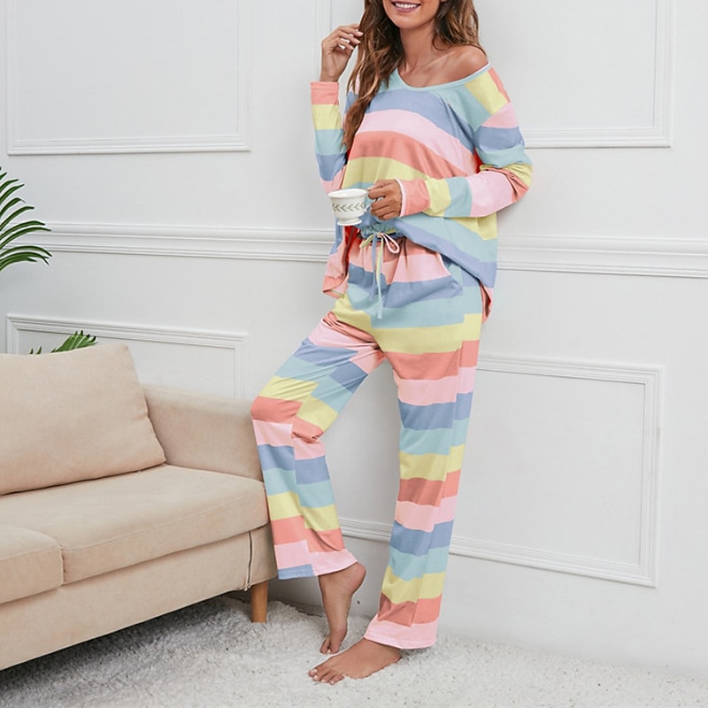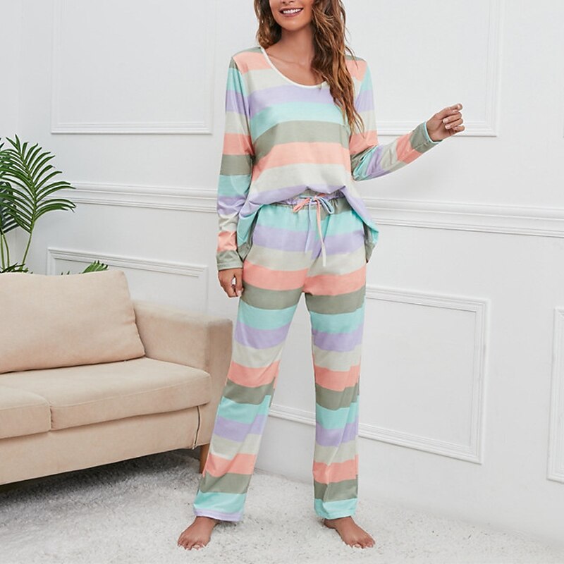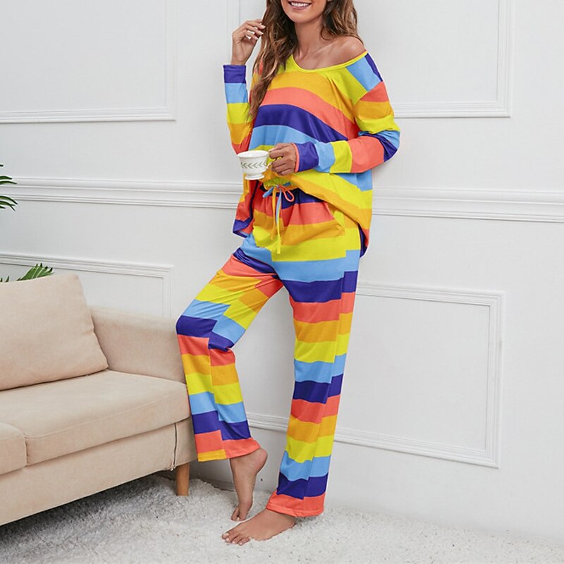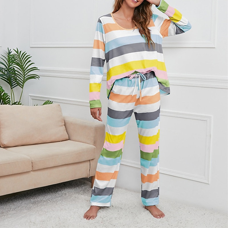 More information about Women's Pajamas Nighty Pjs Sets 2 Pieces Rainbow Stripe Fashion Comfort velvety Home Daily Bed Cotton Breathable V Wire Long Sleeve T shirt Tee Pant Spring Fall Home Outfits