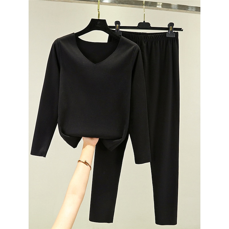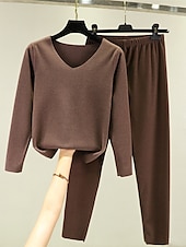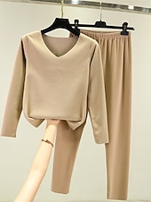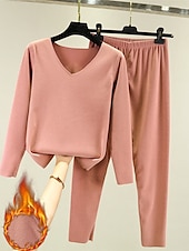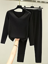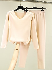 More information about Women's Pajamas Thermal Set Pure Color Fashion Plush Casual Home Daily Bed Acrylic Breathable V Wire Long Sleeve T shirt Tee Pant Fall Winter Home Outfits
