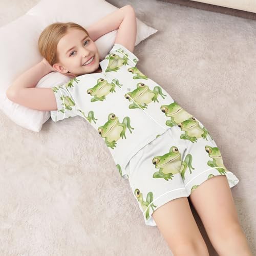 senya Frog Watercolor White Satin Summer Pajama Sets Silk Short Sleeve Button Down Sleepwear