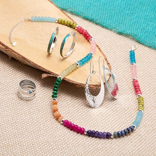 - These hoop earrings are adorned with vibrant 32.8mm by 2.7mm compressed turquoise stones. They radiate shades reminiscent of ocean blues and desert skies. With their organic, earthy feel, the hoops evoke a sense of wonder and creativity. The pieces come with ".925" sterling silver quality stamps as symbols of guaranteed product quality.