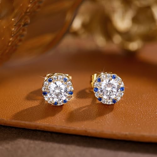 Round Cut Clear Cubic Zirconia Stud Earring for Women and Men, 14K Yellow Gold Plated Hypoallergenic Halo Earrings with Blue CZ