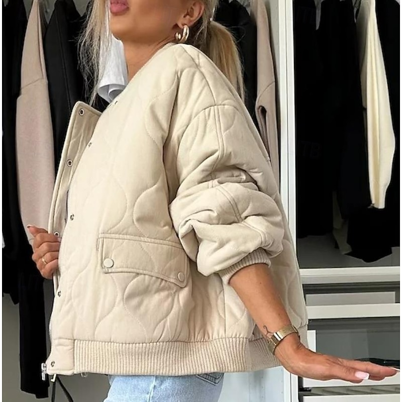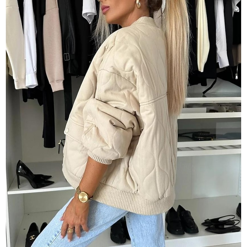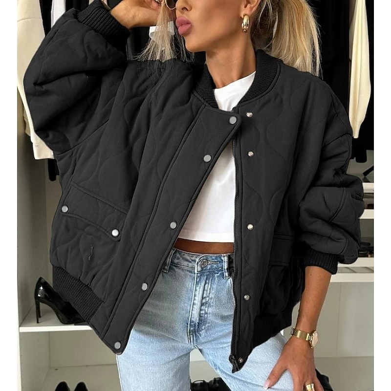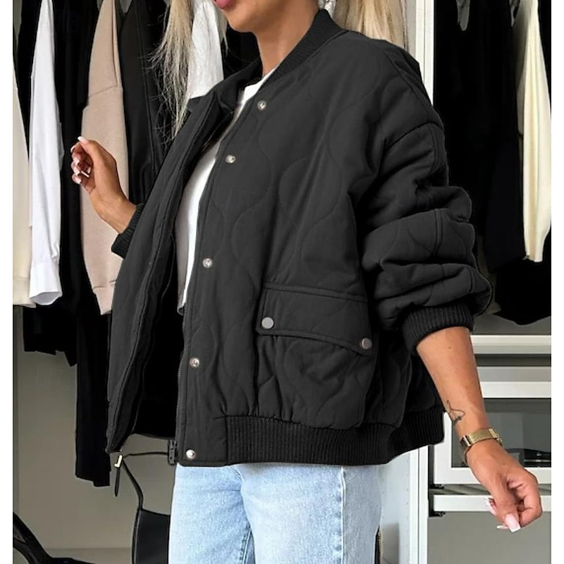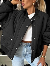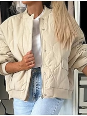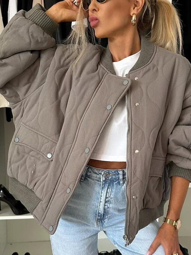 Highlights [Women's latest Quilted Winter Coat] This elegant winter coat is crafted from high-quality polyester, ensuring warmth and comfort for those chilly fall and winter days. The fabric's quilted texture not only provides insulation but also adds a touch of sophistication to your look. The classic bomber silhouette, complete with a ribbed stand collar, cuffs, and hem, ensures a snug fit, perfect for casual street style. [Design Features] The coat is thoughtfully designed with a button-up front and a versatile zipper closure, offering both style and security. Practical zipper pockets provide convenient storage for your essentials, making this piece as functional as it is fashionable. The plain design in muted tones like black, dark grey, and khaki allows easy pairing with various outfits. [Occasion Versatility] Whether for daily wear, vacation, or a casual outing, this coat suits a variety of occasions. It pairs effortlessly with different looks, making it a go-to piece for any laid-back ensemble. Ideal for layering, it provides the perfect blend of warmth and street-chic style. [Size Range] Available in sizes S, M, L, XL, and 2XL, this coat is designed for a regular fit, ensuring comfort for a wide range of body types. Perfect for everyday use. first-class materials and excellent craftsmanship ensure long-lasting durability.