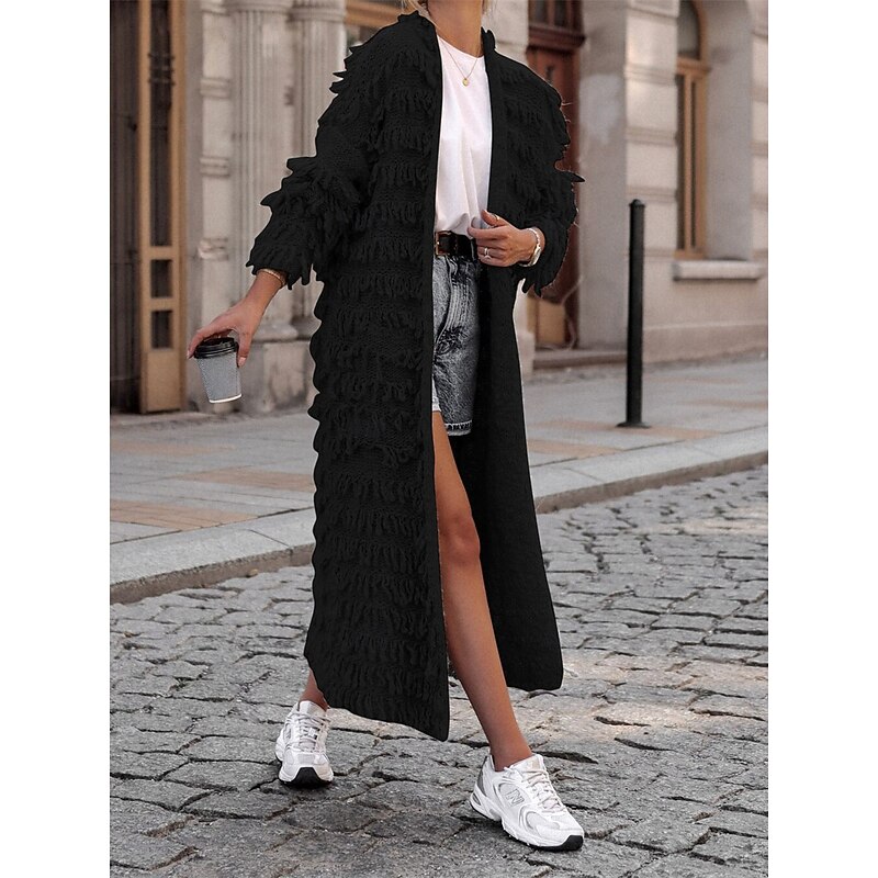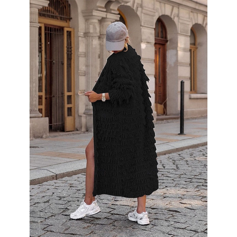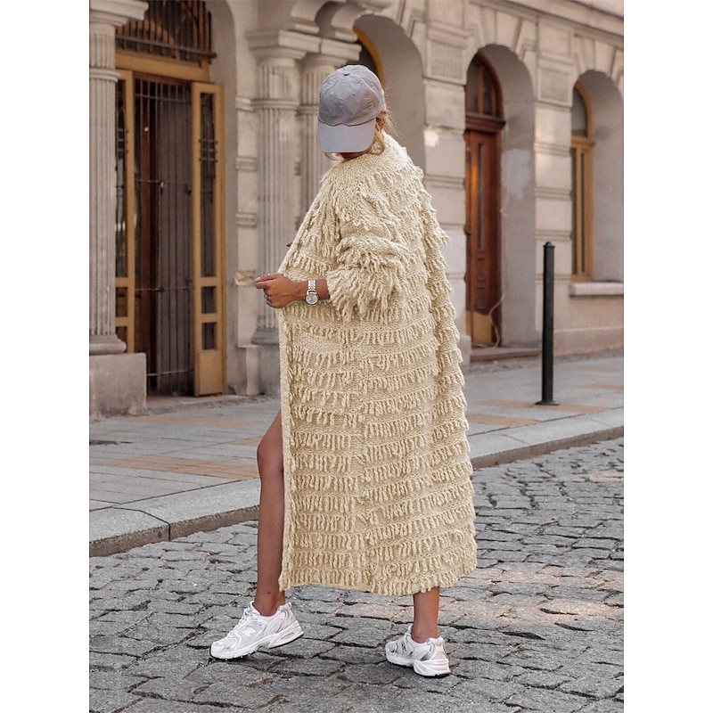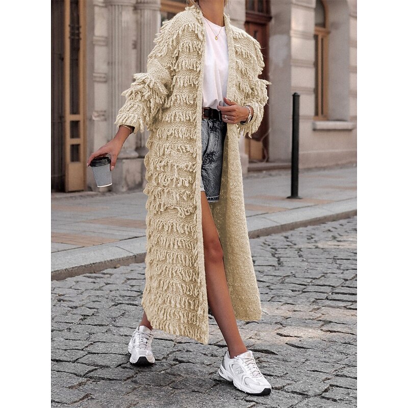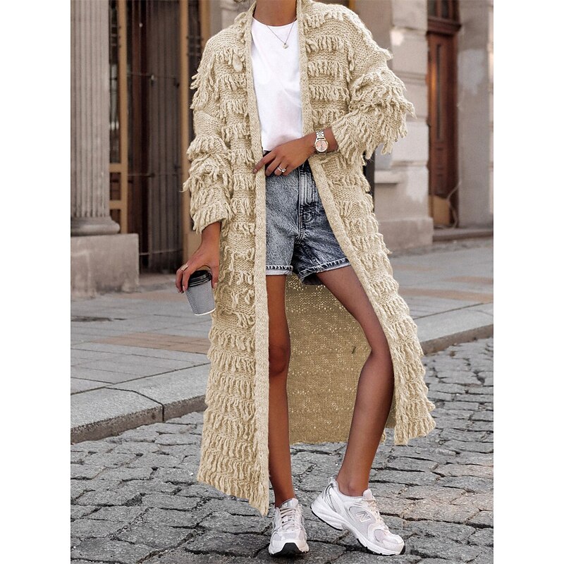 Women's Sweater Cardigan Casual supple Pure Color Ribbed Open Front Tassel Knitted Long Sleeve Long Tops Knit Outdoor Daily Weekend Black Khaki Fall Winter