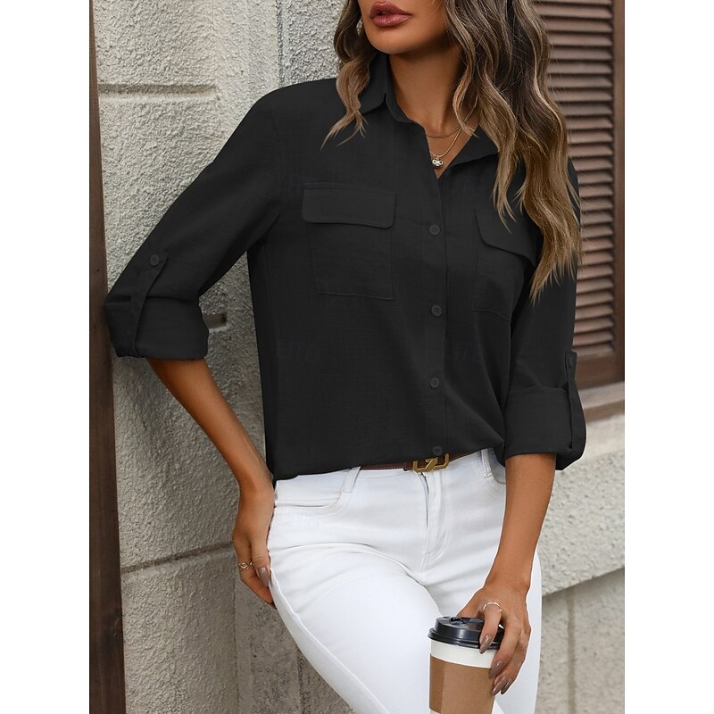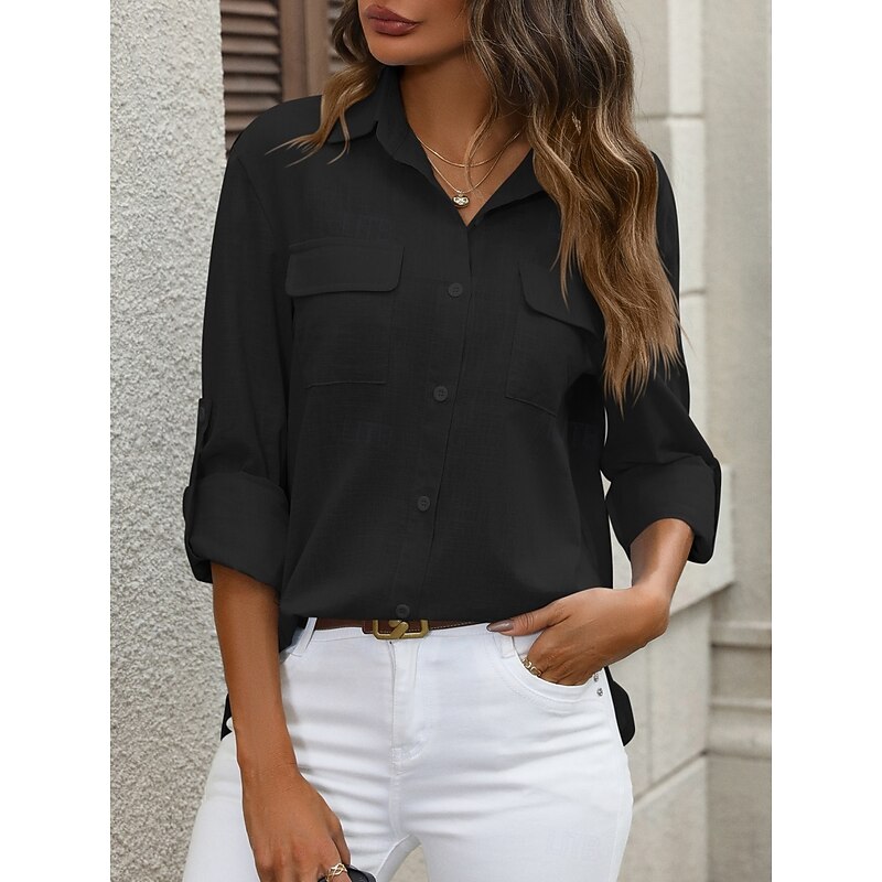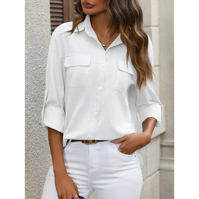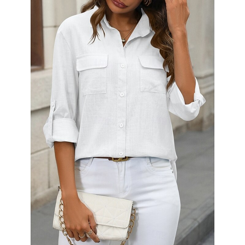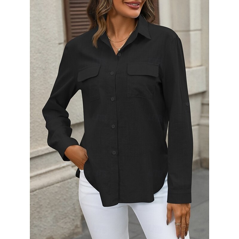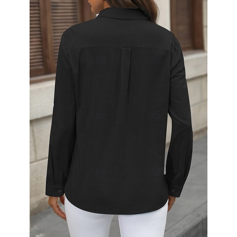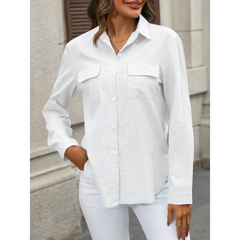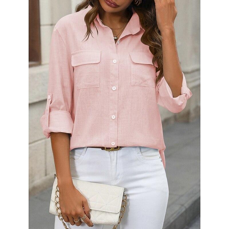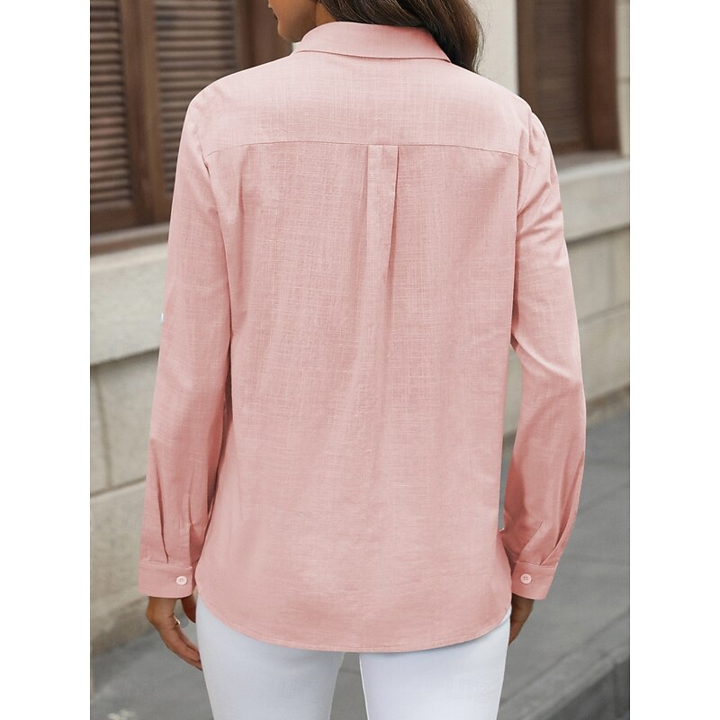 More information about Women's Cotton Linen Shirts Solid Color Elegant contemporary Basic Long Sleeve Shirt Collar Regular Tops Daily Buttons Pocket Black White Pink Blue Summer