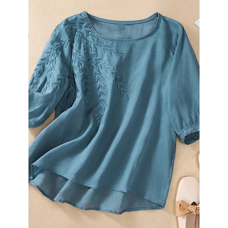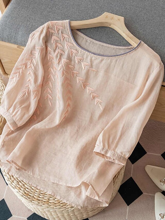 Why Choose Women's Cotton Linen Shirts Floral Basic Casual 3/4 Length Sleeve Crew Neck Regular Tops Daily Embroidered Black Yellow Pink Blue Summer?