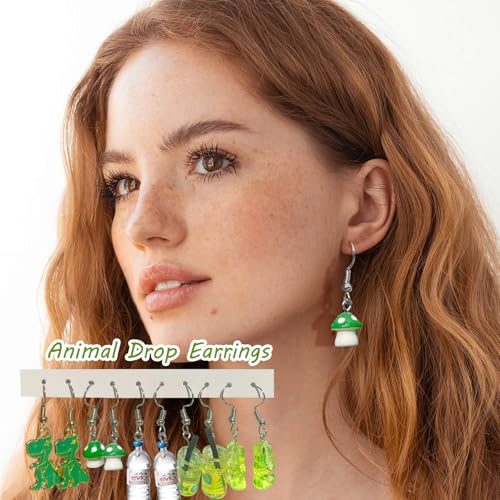 • FUNNY EARRINGS FOR WOMEN: The cute earrings set contains 24 pairs of earrings (5 pairs and 3 pairs in a card), including mushroom earrings, gummy bear earrings, milk tea earrings, daisy flower earrings, cloud earrings, rainbow earrings, dinosaur earrings, strawberry earrings, ice cream earrings, frog drop earrings, duck earrings, cat earrings, lollipop earrings, funny water bottle earrings, etc. Good for your daily wearing