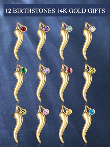 Italian Horn Necklace for Women, 14K Gold Cornicello Jewelry with Birthstone Pendant, Good Luck Talisman Protection Gifts for Her