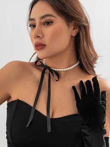 Boho Pearl Bow Choker Necklace Black Long Ribbon Bow Collarbone Chain Vintage Pearl Beaded Choker Necklace Birthday Party Jewelry for Women (Black)