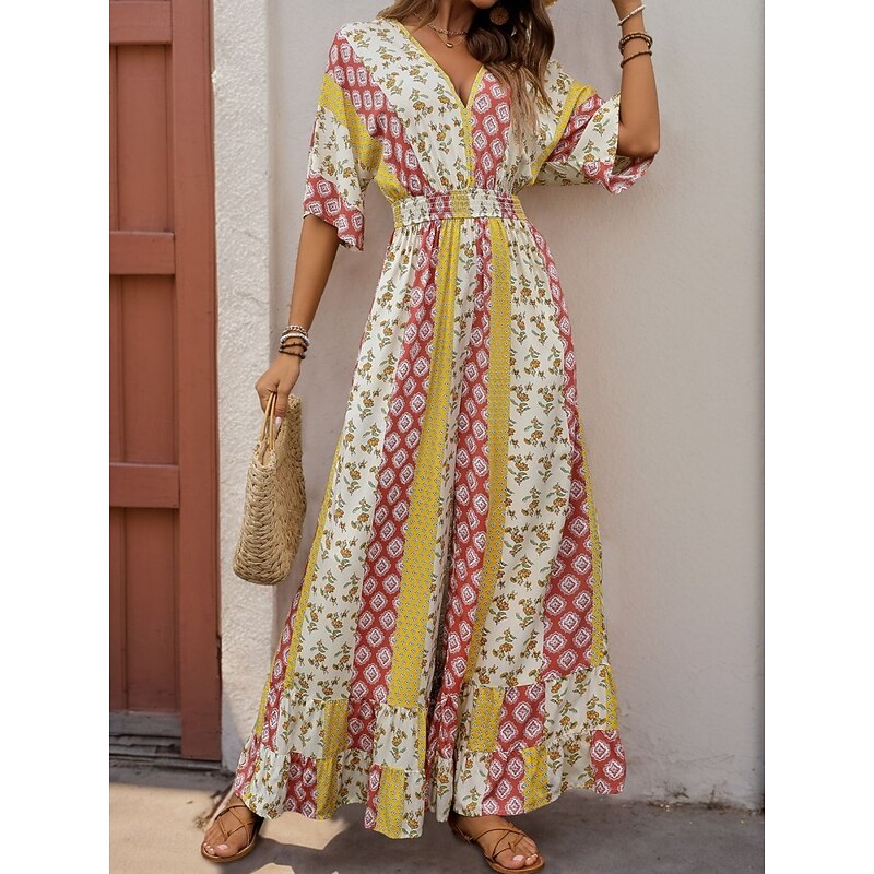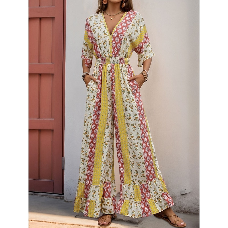 trending ! Women's Normal Jumpsuit Holiday Floral 3/4 Length Sleeve V Neck High Waist Vacation Daily Regular Fit Yellow Summer