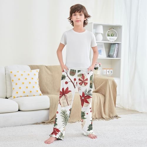 ZZXXB Christmas Mistletoe Branches Boys Long Pants silky Trousers Elastic Waist Kids Lounge Bottoms with Pockets S-XL