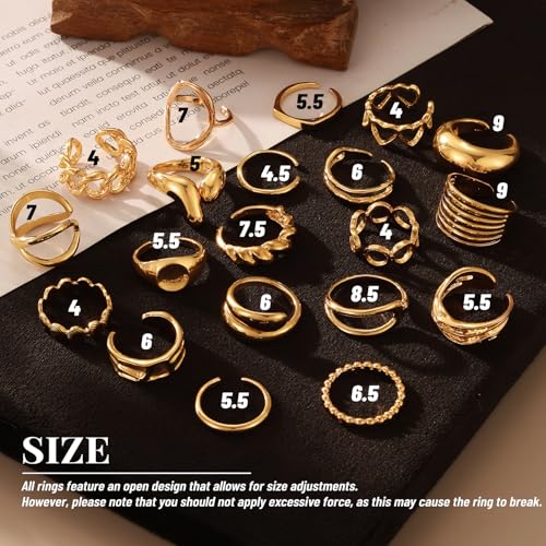 Ring size: 5 6 7Material: MetalMetal type: No Metal TypeGem type: No GemstoneCHUNKY GOLD JEWELRY: One order includes 20 pcs different style rings, twisted ring, dome ring, croissant ring, band ring, etc. These gold rings can be worn alone or stacked with other ringsGOLD PLATED RINGS: These gold rings are made of material, KC gold plated, smooth surface won't scratch the skin, good luster, not easy to fade and oxidize, hypoallergenic, ladies can wear it with confidenceSTACKABLE RINGS for WOMEN: This ring set is a mix of sizes, with the smallest being a 4 and the largest being a 9. Most sizes are around 6.5, so whether you have a pinky or a thumb, you will have the right ring to wear. And each ring size is open designOCCASIONS: Gold is a timeless color. This ring set is the impeccable accessory jewelry for your daily wear, work, parties, weddings and dinnersCARE: To maintain the appearance of the rings, avoid exposing them to harsh chemicals or abrasive materials; remove before swimming or showering; avoid bumping the ring against other hard surfaces; keep them in a jewelry box/jewelry bag when not in useKISS WIFE JEWELRY: Your satisfaction is our unremitting pursue! If you have any question, please feel free to contact us Perfect for everyday use. premium materials and excellent craftsmanship ensure long-lasting durability.