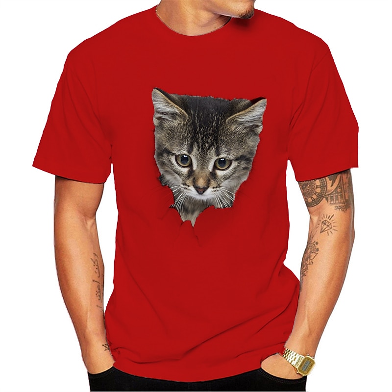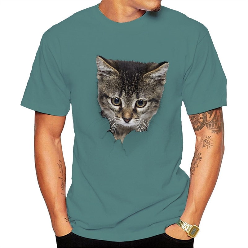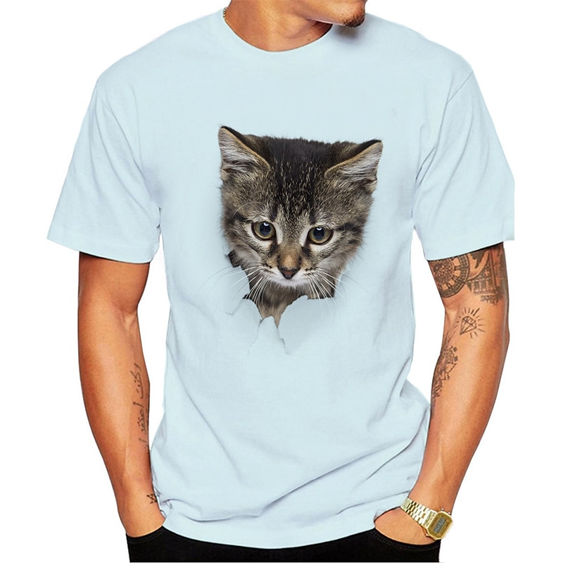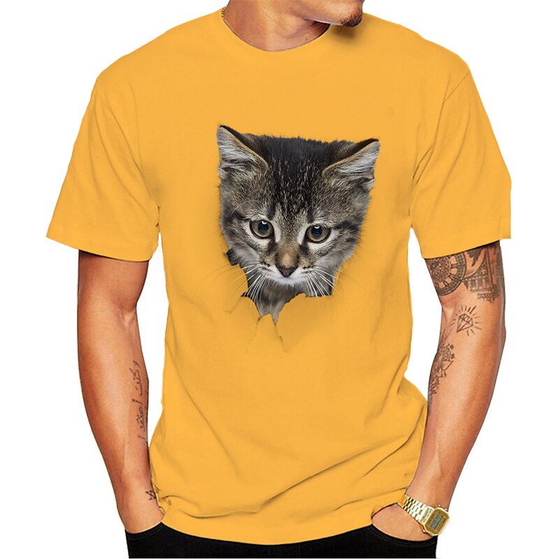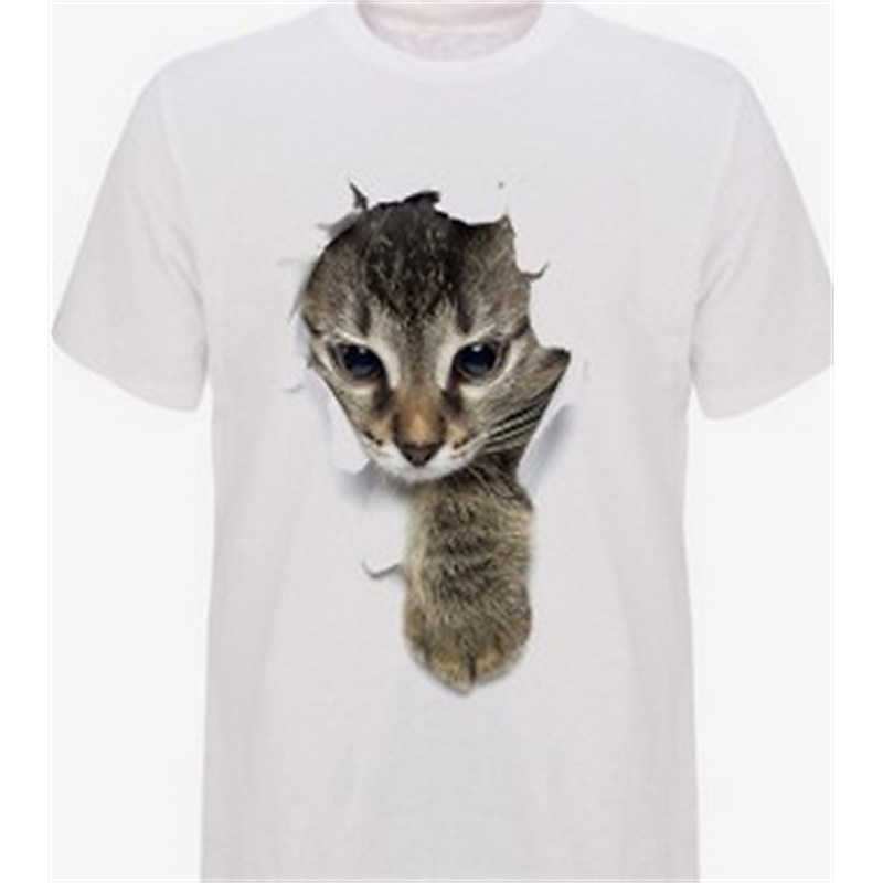 Featuring a striking 3D graphic of a cat playfully peeking through the fabric, this T-shirt is designed for those who appreciate distinctive and fun fashion statements. Its vibrant design adds a touch of whimsy while maintaining a versatile and fashionable look.