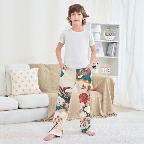Chinese Bird Flowers Boys Long Pants silky Trousers Elastic Waist Kids Lounge Bottoms with Pockets S-XL