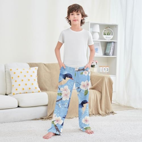 trending ! Birds Plum Flowers Boys Long Pants supple Trousers Elastic Waist Kids Lounge Bottoms with Pockets S-XL