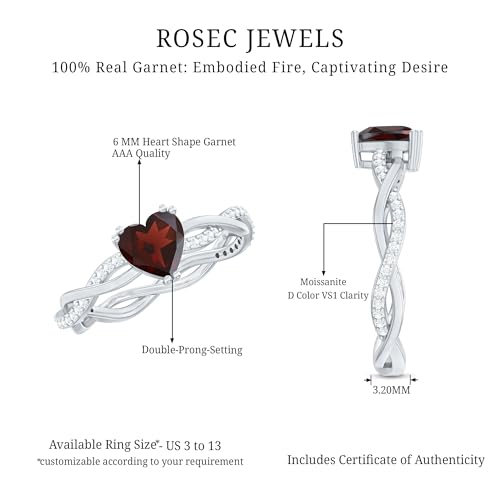 Ring size: 5Material: Garnet, Moissanite, Sterling SilverMetal type: Sterling SilverMetal weight: 2 gGem type: Garnet, MoissaniteItem type name: Engagement RingsThe heart symbolizes love, care and a lasting commitment. This Garnet Heart Engagement Ring, featuring a modern braided design, embodies the enduring nature of your special bond. Crafted to endure the test of time, it is the perfect way to celebrate your special connection with your loved one.100% Natural and Certified Garnet, a Purifying Stone - Known as a symbol of love and trust. Do good, and more good will be conferred upon you. Birthstone for January born people.Quality Assurance- 925 Sterling Silver; Garnet Quality: AAA ; Total Garnet Carat : 1.10 (Approx.); Moissanite Quality: D-vs1 ; Total Moissanite Carat : 0.14 (Approx.)Safe and Secure Packaging - All of our jewelry items arrive in high-end signature jewelry pouch, ensuring they are ready for proposals/gifting purpose so that you don't have to spend any time in packing them.Shop with Confidence - Rosec Jewels assures you to get people's heads turned with our sparkling jewelry pieces which are authentically certified just for your peace of mind. sku:-RCRI112410035 Perfect for everyday use. premium materials and excellent craftsmanship ensure long-lasting durability.