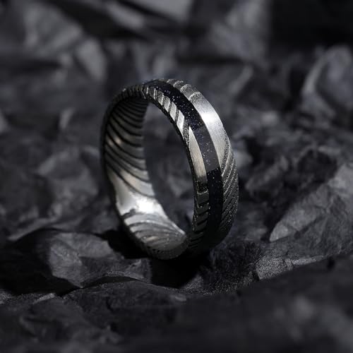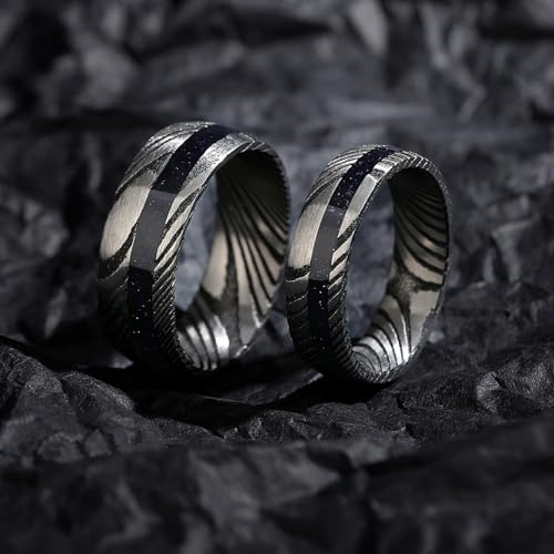 Ring size: AdjustableMetal type: AlloyGem type: No GemstonePREMIUM DAMASCUS STEEL: These rings are expertly crafted from high-quality Damascus steel, ensuring durability and a stunning, unique pattern that symbolizes strength and commitment.ELEGANT BLUE GOLD SAND INLAY: Each ring features a captivating blue gold sand inlay set in circular grooves, filled with resin for a sleek and polished finish, adding a touch of elegance and a unique sparkle to your special bond.PERFECT FOR COUPLES: The set includes a 6mm ring for her and an 8mm ring for him, designed to complement each other beautifully, making them ideal for weddings or anniversaries.VERSATILE GIFT OPTION: These rings are perfect for any occasion, whether it's a wedding, anniversary, or a heartfelt promise, representing love and connection.PERSONALIZATION AVAILABLE: Customize your rings with an engraving to make them uniquely yours, adding a personal touch to your meaningful jewelry. Perfect for everyday use. first-class materials and excellent craftsmanship ensure long-lasting durability.