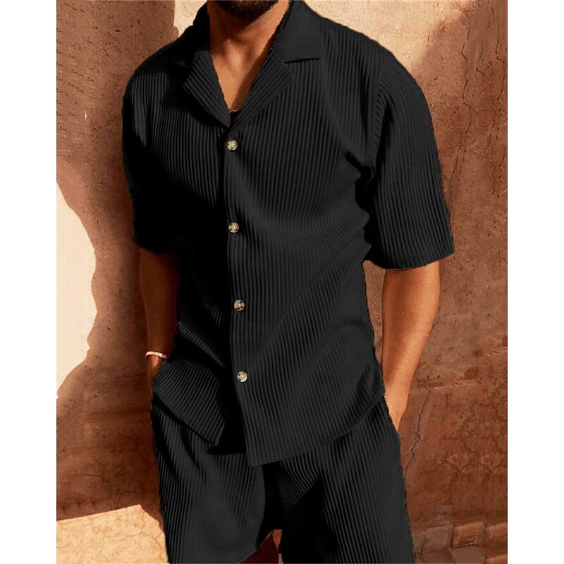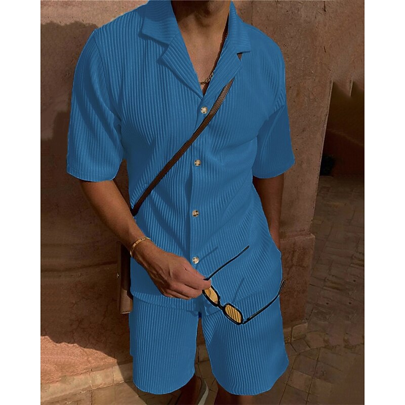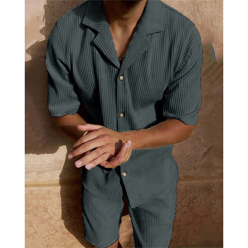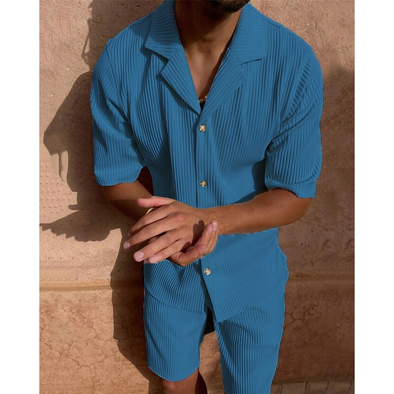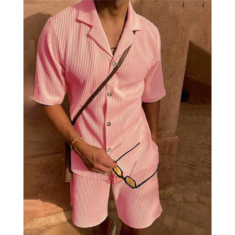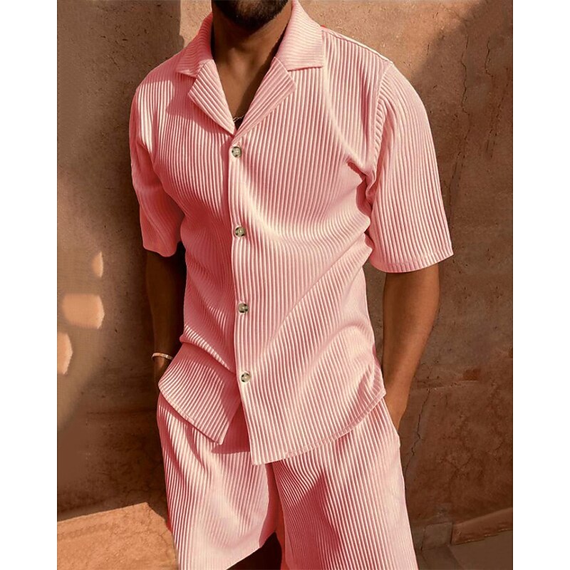 More information about Men's Corduroy Shirt T-shirt Suits 2 Pieces Outfits Tee & Shorts Short Sleeve Lapel Summer Plain Fashion Casual 2 Piece Vacation Daily Wear Going out Black Pink Blue Top Tee for Men