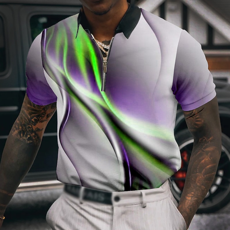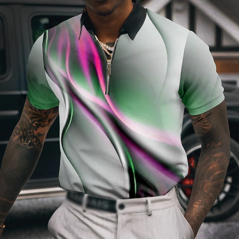 Highlights [Fabric] : Crafted from a high-quality polyester and spandex blend, this men's polo shirt ensures a lightweight, stretchy, and breathable experience that keeps you cool and comfortable throughout the day. [Style] : Featuring a classic polo silhouette, this shirt offers a modern fitted cut that enhances the physique, making it both chic and elegant. [Design Highlights] : The shirt showcases a striking geometric 3D print and a sleek quarter-zip design. The contrasting black collar adds a contemporary touch to the traditional polo style, offering a unique blend of timeless elegance and urban flair. [Occasions] : Perfect for various settings, this versatile polo shirt can be worn for business casual events, vacations, formal occasions, or festivals, providing a sophisticated yet relaxed look suitable for any smart-casual affair. [Size Range] : Available in a wide range of sizes from S to 5XL, ensuring a comfortable fit for all body types. The available colors, including Blue, Green, Orange, Gray, Purple, Light Green, and White Gray, offer diverse styling options. Perfect for everyday use. premium materials and excellent craftsmanship ensure long-lasting durability.