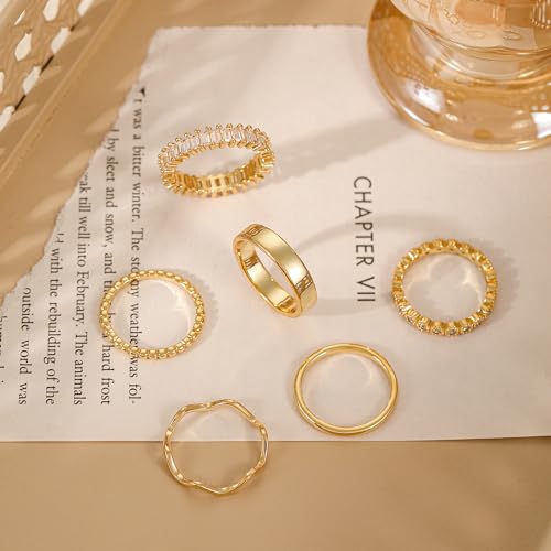 6Pcs 14K Gold Plated Stacking Rings for Women Cubic Zirconia Wave Stackable Thin Gold Ring Plain Statement Band Promise Eternity Bands Ring Comfort Fit Size 6-9