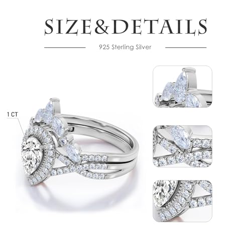 Ring size: One SizeMaterial: MetalMetal type: Sterling SilverGem type: MoissaniteItem type name: Wedding Ring SetsđăPear Wedding Ring SetăThe pear shape bridal ring set is includes engagement ring and wedding band. Its center moissanite is 1.0 carat, D color and VVS1 clarity. The metal part of the moissanite pear wedding ring set is sterling silver.đăAuthentic MoissaniteăMoissanite hardness is mohs 9.25 and it is sparkle and brilliant like diamond. Moissanite is resistant to brasion, breaking or chipping, so it is perfect for wedding ring set material. What's more, moissanite bridal ring set only costs 1/10 of the price of a diamond ring.đăRemind For YouăIf you are not ensure your finger size, please measure your finger size according to our picture, so that to choose the correct size which fit and pleasant pear cut bridal sets wedding rings.đăPerfect SurpriseăThis wedding ring set will be placed in exquisite box. It is the perfect surprise for Engagement, Wedding, Christmas, Thanksgiving, Graduation, Congratulation, Anniversary for women, wife or girlfriend.đăPremium ServiceăOur pear shaped bridal ring set for women will pass rigorous quality inspections before sale. If there are any problem with your womens pear shaped wedding ring sets, please to tell us and we would solve your problem as soon as possible. Perfect for everyday use. premium materials and excellent craftsmanship ensure long-lasting durability.