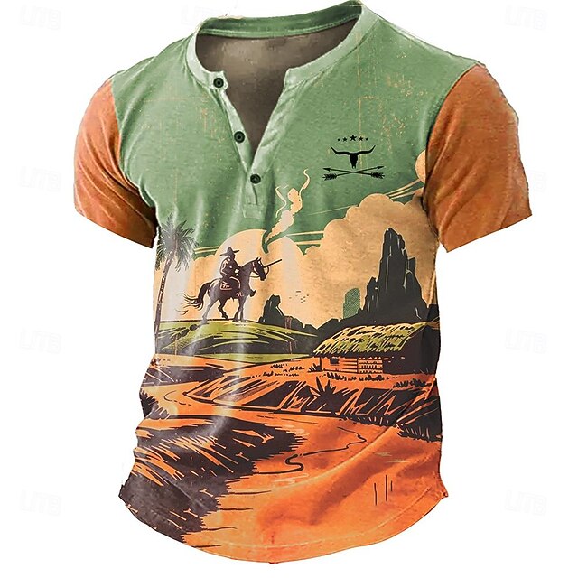 trending ! Men's Cowboy T shirt Henley Shirt Short Sleeve 3D Print Retro Vintage Western Style Street Casual Daily Summer Spring Blue Green Henley Henley T-Shirt