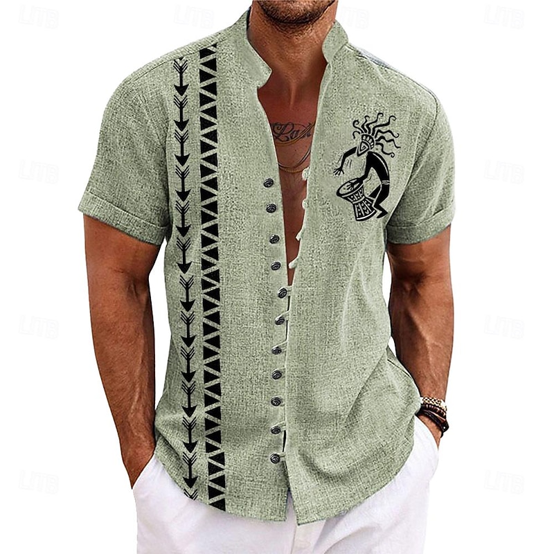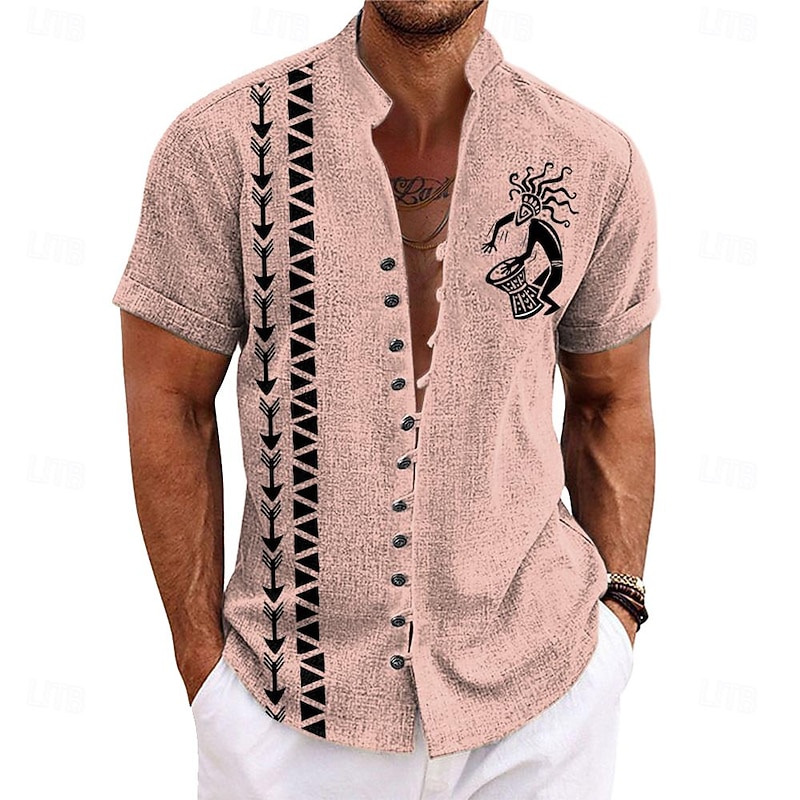 trending ! Men's Ethnic Kokopelli Shirt Button Up Shirt Short Sleeve Casual Tribal Vacation Daily Summer Spring Grandad Collar Band Collar Buttons Print Pink Blue Green Khaki Beige