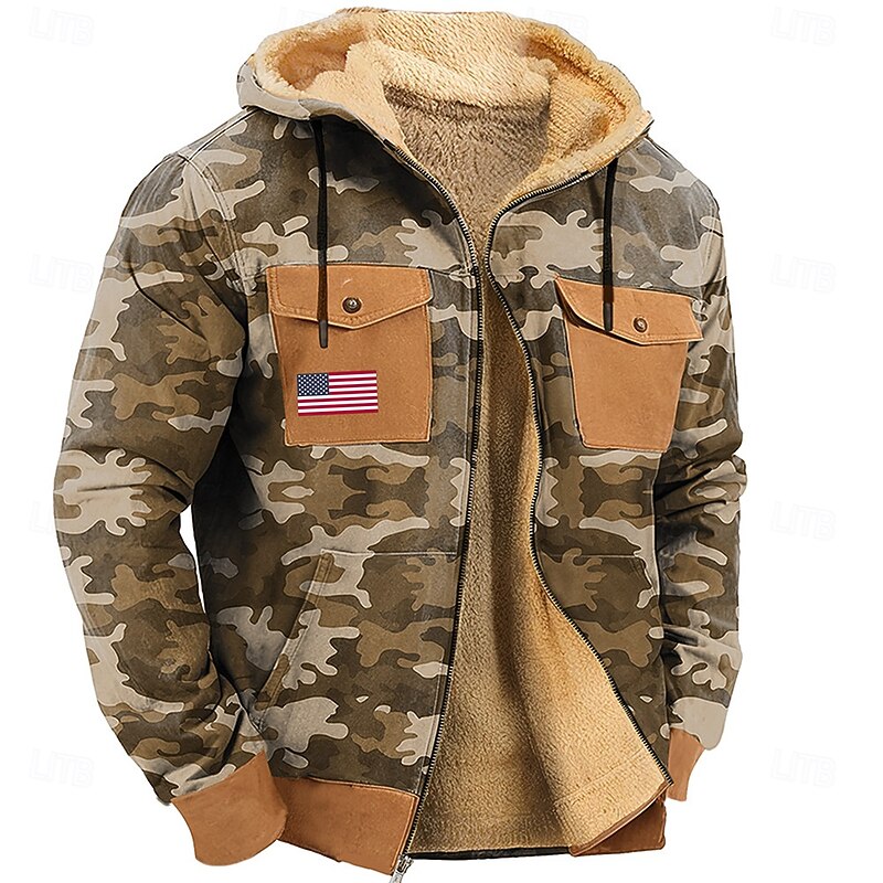 Highlights [Fabric] : Crafted from durable polyester, this men's hoodie features a plush fleece lining for optimal warmth and comfort. The fabric is micro-elastic, providing ease of movement and flexibility, making it an ideal choice for both outdoor adventures and everyday wear. [Fit Type] : Tailored for a fitted look, this hoodie combines functional design with a trendy silhouette. The long sleeves and micro-elastic fit ensure comfort and style, perfect for cool fall and winter days. [Design Highlights] : This hoodie boasts a rugged camouflage pattern with a 3D print design for a modern touch. It includes a convenient zip-up front for easy wear, adjustable hood, and zip pockets for secure storage. The reinforced cuffs and contrasting hem add an extra layer of durability, while the country flag patch further enhances its bold style. [Occasions] : Versatile in use, this hoodie is perfect for streetwear fashion, casual outings, and hunting trips. Its fashionable look and practical features make it suitable for various activities and settings. [Size Range] : Available in a wide range of sizes from S to XXXL, catering to various body types. Please refer to the size chart for an optimal fit. Perfect for everyday use. first-class materials and excellent craftsmanship ensure long-lasting durability.