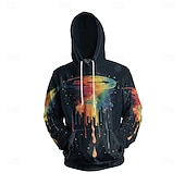 : This hoodie showcases a stunning black graphic print with a contemporary and artistic 3D galaxy pattern in vibrant colors like orange, blue, and yellow. The eye-catching dripping paint effect adds a bold statement to your outfit. The retro silhouette includes a practical front pocket and an adjustable drawstring hood, combining style with functionality.