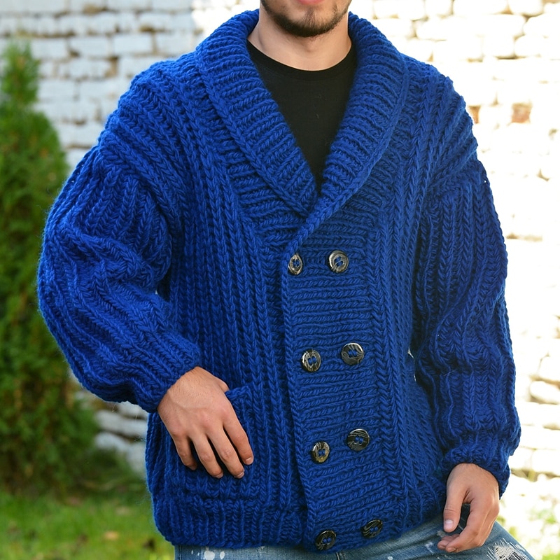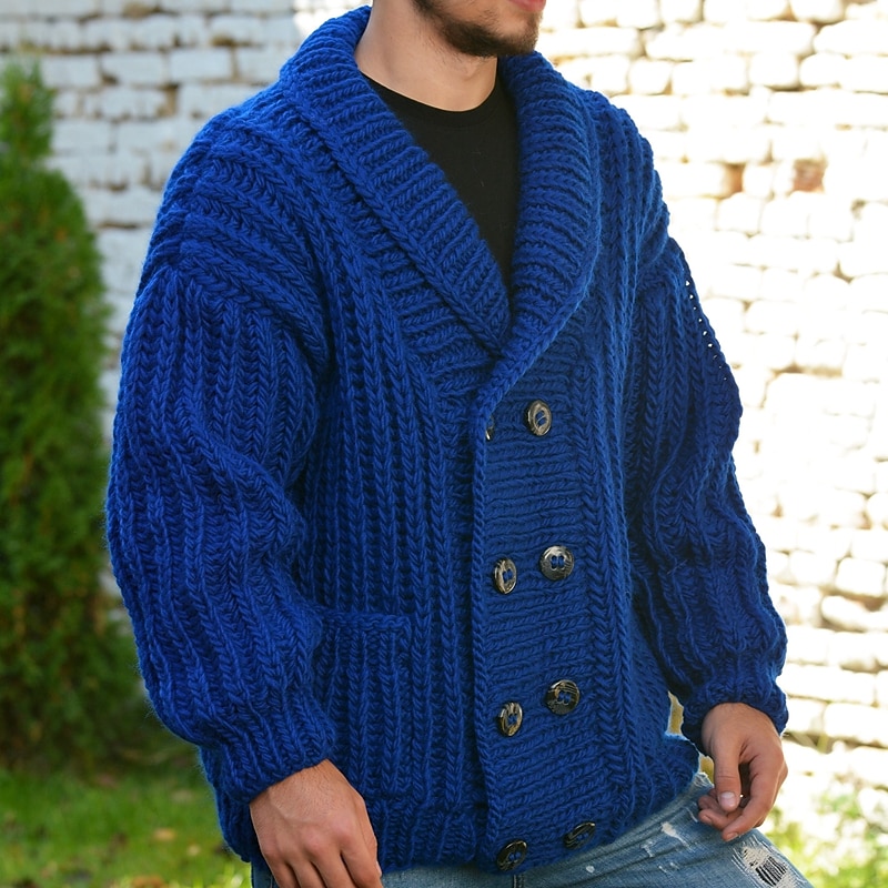 Highlights [Fabric] : This men's cardigan sweater is crafted from a high-quality cotton and polyester blend, offering a chunky knit texture for extraordinary warmth and softness, ideal for fall and winter. The stretchy fabric ensures comfort while maintaining its luxurious feel. [Fit] : Designed with a loose fit, this cardigan provides a relaxed and cozy experience. Its drop shoulder style enhances the laid-back vibe, making it a perfect addition to any casual wardrobe. [Design Highlights] : Featuring a double-breasted front with large, prominent buttons, this sweater delivers a timeless yet bold aesthetic. The broad shawl collar adds a touch of elegance, while the long sleeves are accented with ribbed cuffs for a snug fit. Additionally, convenient pockets add practicality and style. [Occasions] : This royal blue cardigan is suitable for various casual occasions, from leisurely weekends to social gatherings. Its versatile design makes it a standout piece for chilly days, combining style and functionality seamlessly. [Size Range] : Available in sizes M, L, XL, 2XL, and 3XL, offering a suitable fit for a broad range of body types, ensuring comfort and style for everyone. Perfect for everyday use. first-class materials and excellent craftsmanship ensure long-lasting durability.
