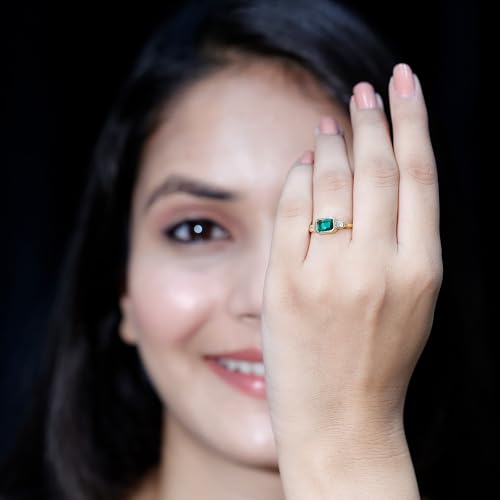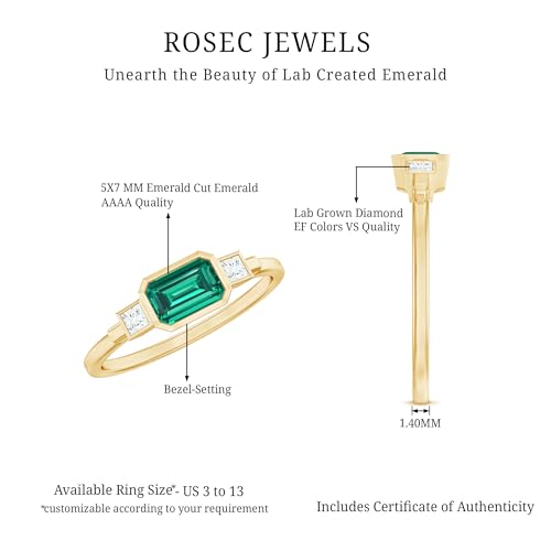Ring size: 5Item width: 5 millimetersMaterial: Lab Grown Emerald, Lab Grown Diamond, Gold Plated Solid GoldMetal type: Yellow GoldGem type: Created Diamond, Lab Grown EmeraldItem type name: Promise RingsOffering a unique and stylish look, this Lab Grown Emerald Ring embraces a uniquely sophisticated appearance that makes it a practical yet stylish symbol of your love. As a symbol of your unique and modern love story, it has a bold yet elegant design, offering a timeless representation of your commitmentCreated Emeralds personifies elegance and class. Perfect to join your jewelry collection that compliments you and bring out your inner sparkle the way you want. We use finest in created emerald with perfect Green which will enhance attractiveness of your Jewelry.Quality Assurance- Gold Plated Solid Gold; Lab Grown Emerald Quality: AAAA ; Total Lab Grown Emerald Carat : 0.90 (Approx.); Lab Grown Diamond Quality: EF-VS ; Total Lab Grown Diamond Carat : 0.12 (Approx.)Safe and Secure Packaging - All of our jewelry items arrive in high-end signature jewelry pouch, ensuring they are ready for proposals/gifting purpose so that you don't have to spend any time in packing them. To assist you in avoiding unnecessary hassle, we provide our ring sizing kit to you.Shop with Confidence - Rosec Jewels assures you to get peoples heads turned with our sparkling jewelry pieces which are authentically certified just for your peace of mind. sku:-RCRI062510030 Perfect for everyday use. premium materials and excellent craftsmanship ensure long-lasting durability.