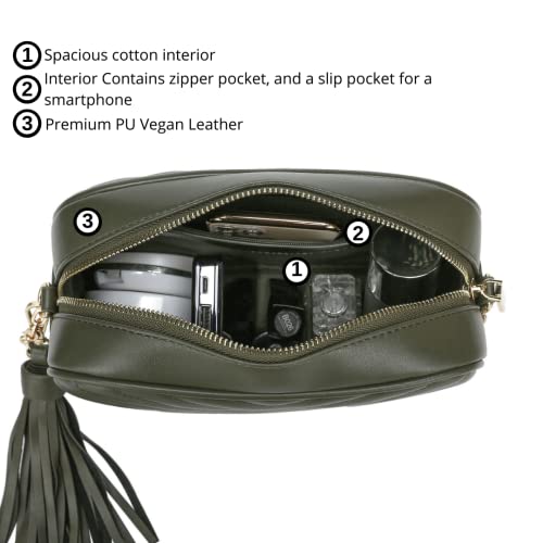 Fabric type: Vegan LeatherOrigin: ImportedClosure type: ZipperLining: CottonShoulder Cross Body Bag & Detachable Tassel - With this shoulder cross body bag you can organize all your personal essentials with relative ease. You can carry all your cards, passport, IDs, receipts, cell phones, tickets, and other items securely. A detachable tassel decoration is attached to the side of the bag.Quilted Cross Body Bag - This quilted cross body bag has gold hardware and cotton lining. Dimensions are 9.4 L X 6.7 H X 2.95 D. Chain drop is 20-23PU Vegan Leather Cross Body Bag - This PU vegan leather cross body bag is designed with luxury, high-quality PU Vegan Leather. PU leather, or polyurethane leather, is an artificial leather made of thermoplastic polymer is completely artificial and is considered vegan.Adjustable Shoulder Strap Cross Body Bag - This cross body bag comes with an adjustable shoulder strap so you can carry it as a shoulder bag, cross body bag, or satchel. Wear it your way and adjust it to suit your height or the way you want to carry it. The shoulder strap is a combination of luxurious chain and PU Vegan leather, making it chic and comfortable to carry.Zipper Closure Cross Body Bag - This cross body bag features a zipper closure. The interior features a zip pocket on the back wall and a slip pocket for a smartphone on the front wall. Perfect for everyday use. premium materials and excellent craftsmanship ensure long-lasting durability.