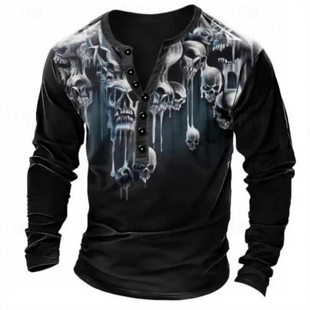trending ! Men's Halloween Graphic Skull T Shirt Henley Shirt Tee Long Sleeve Vintage Designer latest Outdoor Halloween Casual Fall Winter Spring & Summer Black Blue Henley Henley T-Shirt