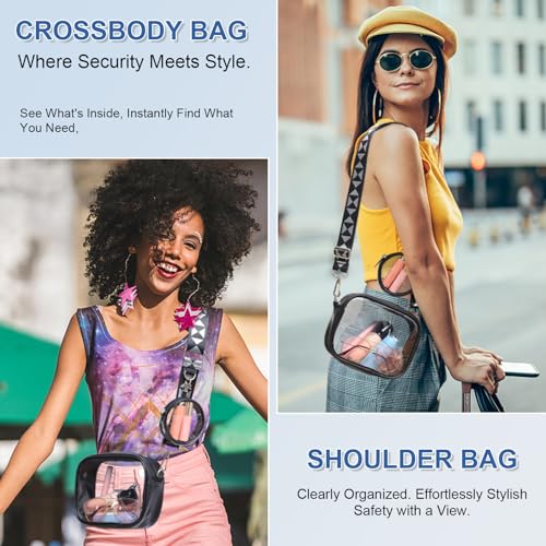 first-class and Lightweight: Lightweight and durable Crossbody Purse Bag are made of waterproof PVC & black leather rather which can stand wear and tear, keeping items secure without adding weight to your package, make it easier to carry.Perfect Size for Carrying Belonging: 7.5W x 6H x 2.7D. Very roomy zippered bag, capable for storing your daily necessities such as your phone, change purse, keys, cosmetics. fashionable round pouch, simple and practical, suitable for lipstick, keys, blush, etc.Clear Bag Stadium Approved: Comply with security policies at airports, stadiums, and more! Many public venues require transparent or mesh bags for security. If you've been looking for a stadium / concert approved purse, this is it! Our See through crossbody bag can be used to sports game, concerts, sport events and etc.Unique Shoulder Straps: Clearworld shoulder bag is simple and stylish. The geometric shape at the shoulder strap is quite designed. Adjustable Cross-body Strap drop from 35.7-57.5 inch, Can be used as a shoulder bag, crossbody bag, handbag,You can totally enjoy the the games or concerts, put your hands up!Ideal Gift: Present a blend of fashion and practicality with our cute, compact clear tote bag, so that you comply with the clear bag policy at the same time become the focus of fashion, is a must-have fashion items for young people. It is the ideal present for any occasion, including birthdays, Valentine's Day, Mother's Day, and Thanksgiving. Perfect for everyday use. High quality materials and excellent craftsmanship ensure long-lasting durability.