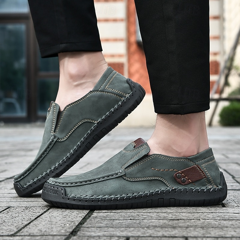 Highlights [Fabric] These men's casual slip-on loafers are crafted from high-quality microfiber, offering both a leather-like texture and durability. The shoes are lined with PU material, providing a soft and comfortable feel for all-day wear. [Style] The loafers feature a vintage moccasin-inspired design, with prominent stitching along the seams that enhance the structural integrity of the shoe. They come in a versatile array of colors, including green, white, black, brown, blue, wine, khaki, and dark green, allowing for a current yet timeless look. [Design Highlights] The loafers feature contrasting brown accents on the vamp and around the stitching, adding a touch of elegance and sophistication. The round toe shape and slip-on closure ensure a comfortable and convenient fit, while the non-slip rubber outsole offers excellent grip and flexibility, ideal for various terrains. [Occasions] These loafers are perfect for everyday wear and outdoor activities, seamlessly transitioning from casual settings to more dressed-up occasions. They provide the perfect blend of comfort and style, making them an excellent choice for those who value versatility in their footwear. [Size Range] Available in a wide range of sizes from US7 / EU39 / UK6 to US12 / EU45 / UK11, these loafers cater to a broad spectrum of foot sizes, ensuring a suitable fit for many individuals.