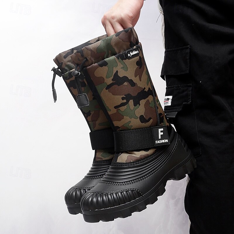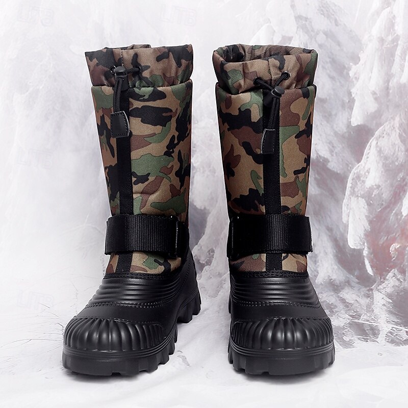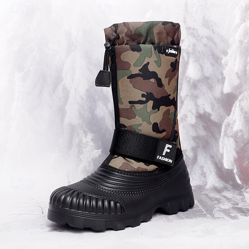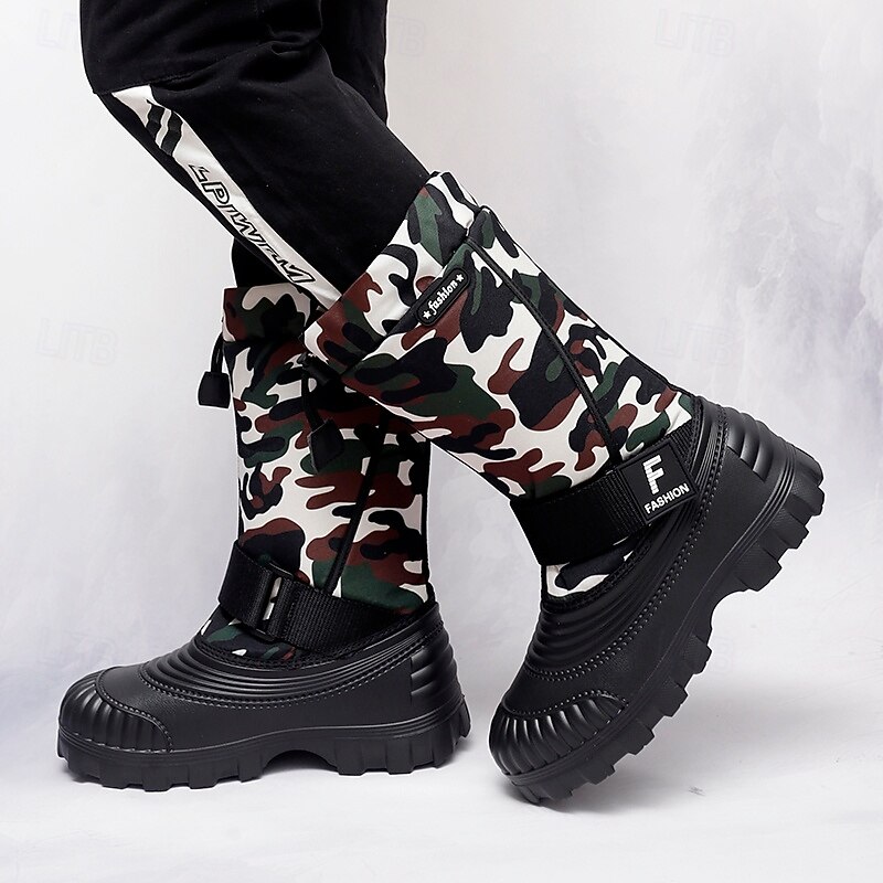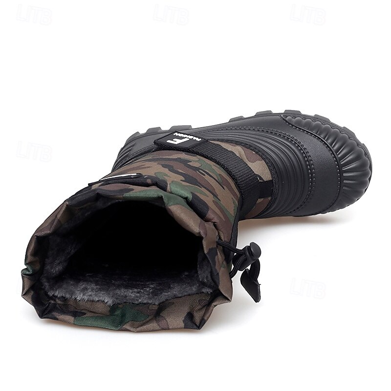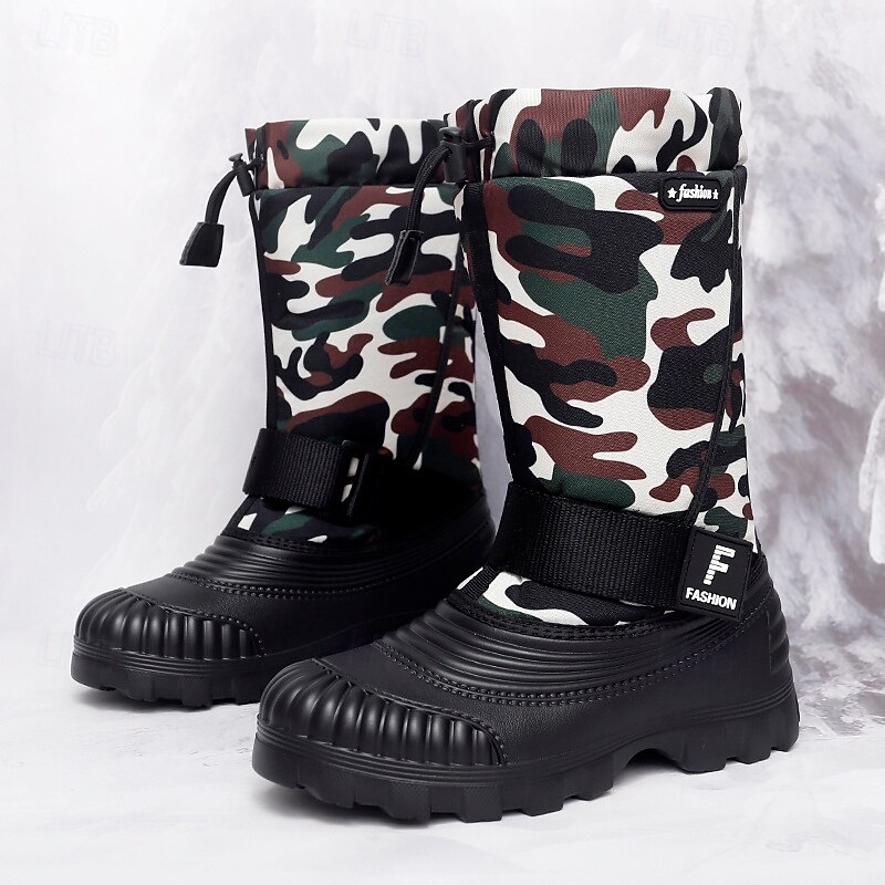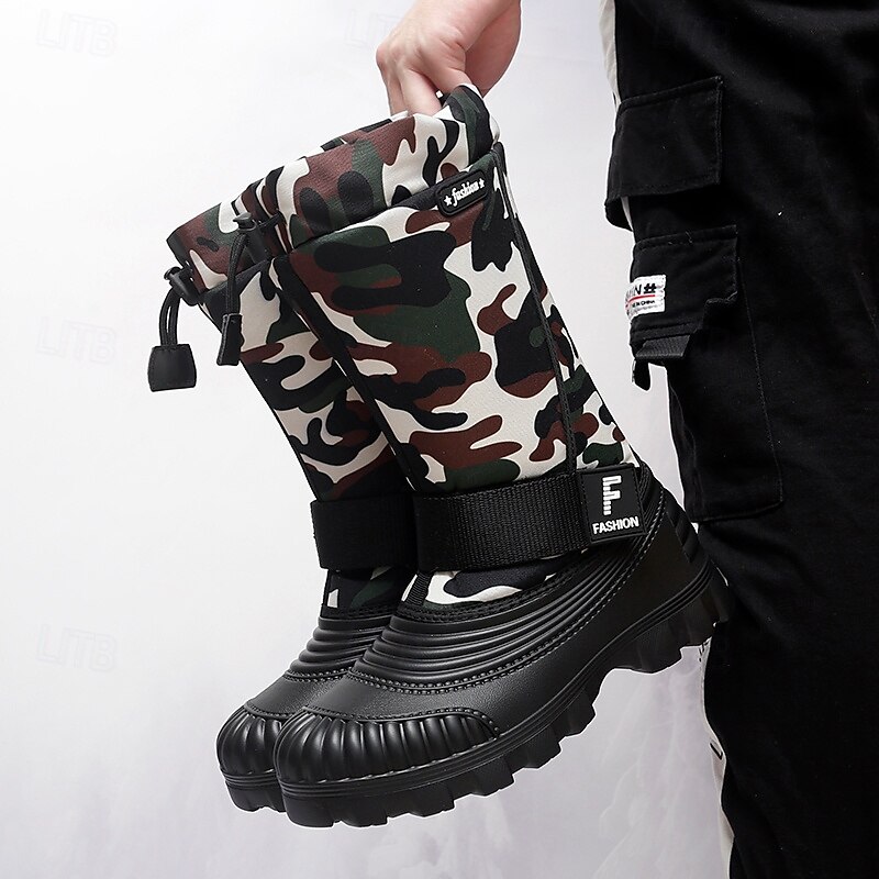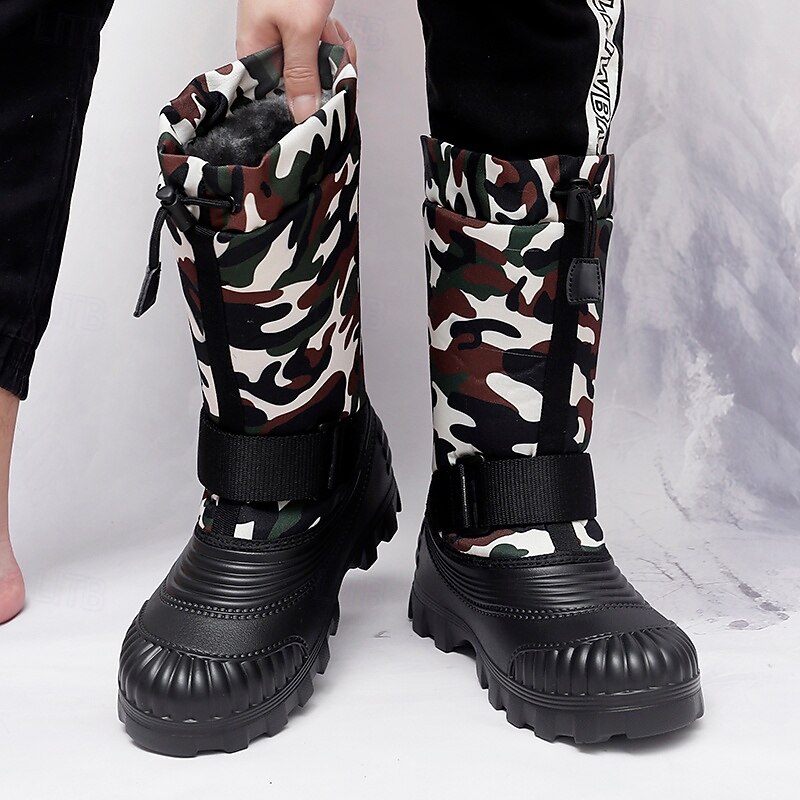 : Featuring a striking camouflage pattern, these boots seamlessly combine fashion with functionality. The non-slip rubber outsole offers excellent traction on wet or icy surfaces, making them a safe option for outdoor activities. The drawstring closure prevents snow and cold air from entering the boots, enhancing their protective capabilities.