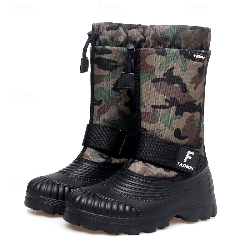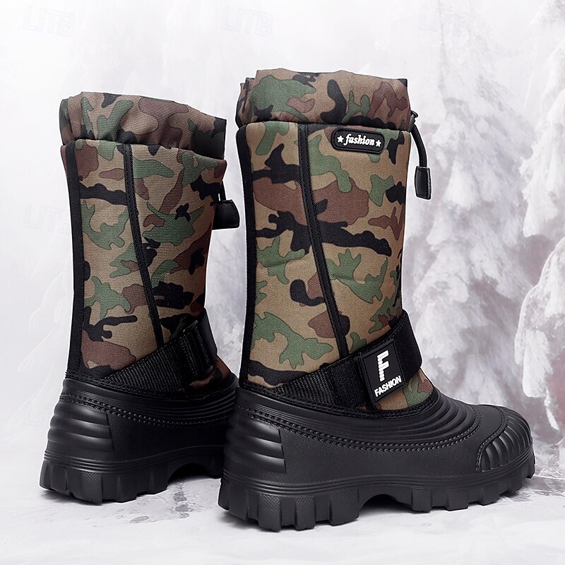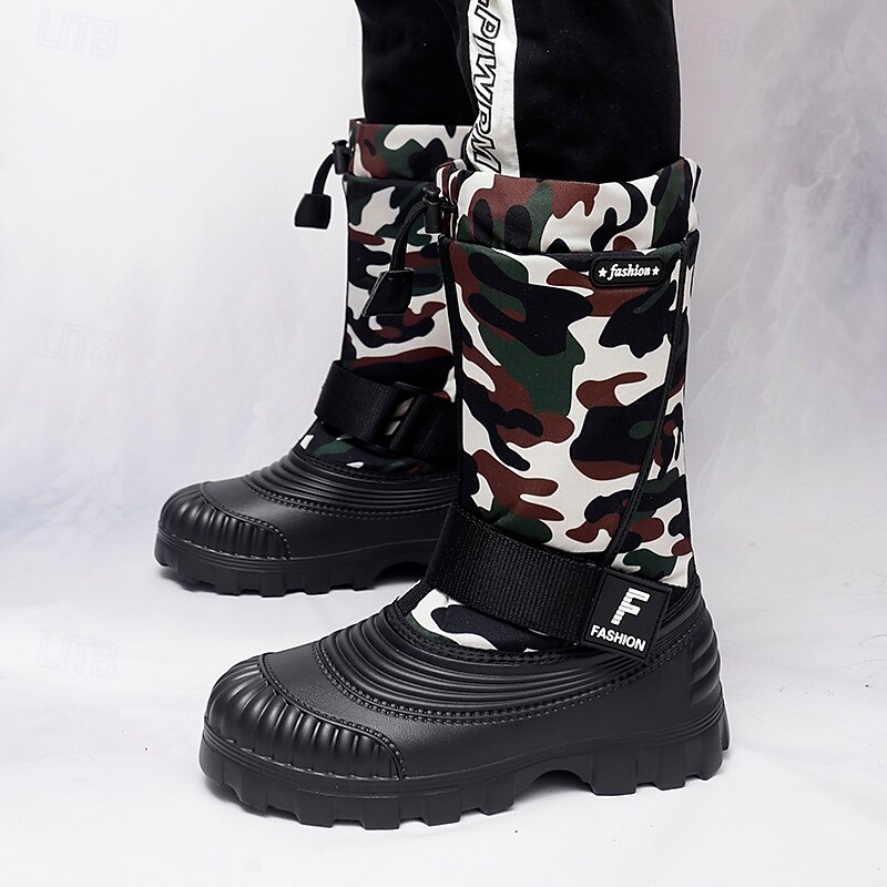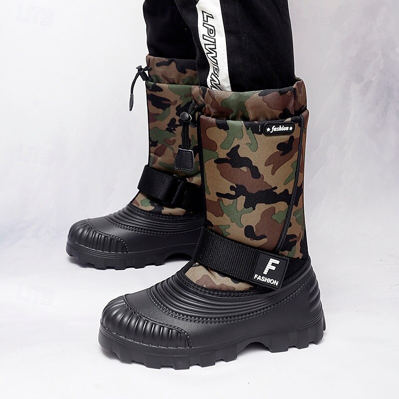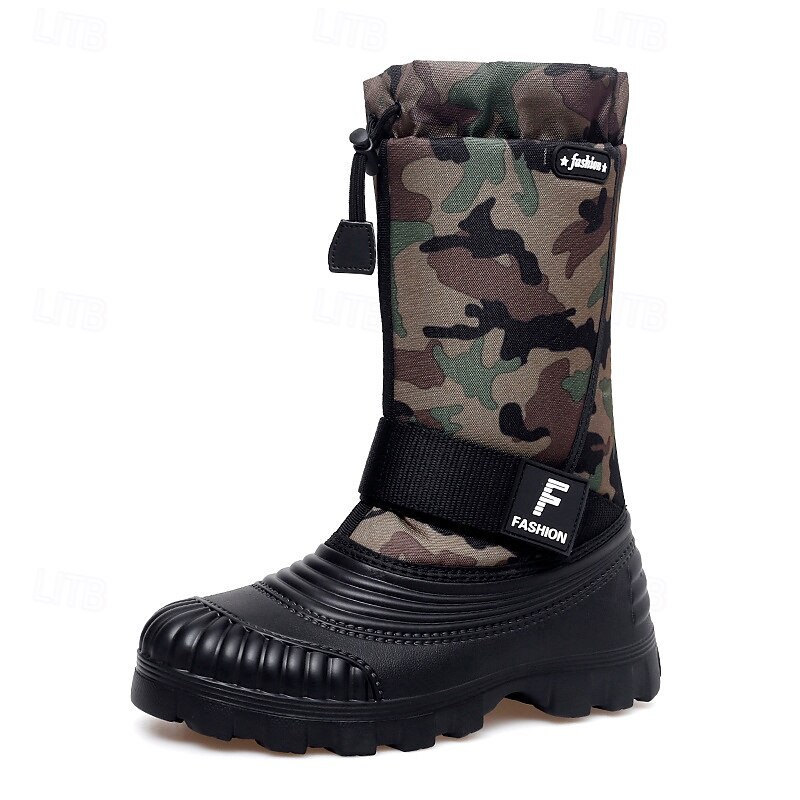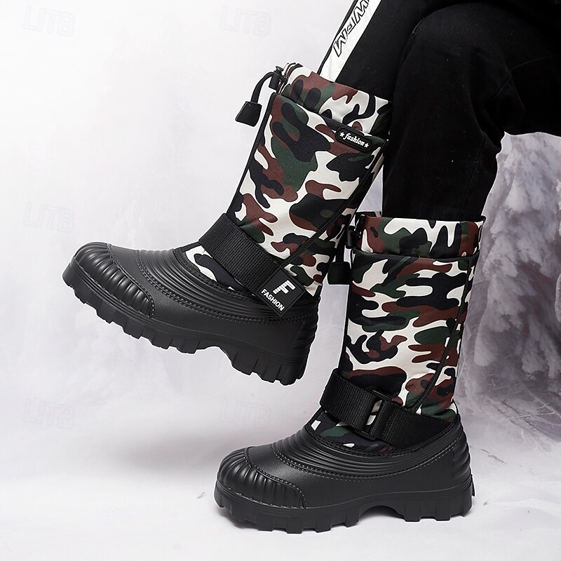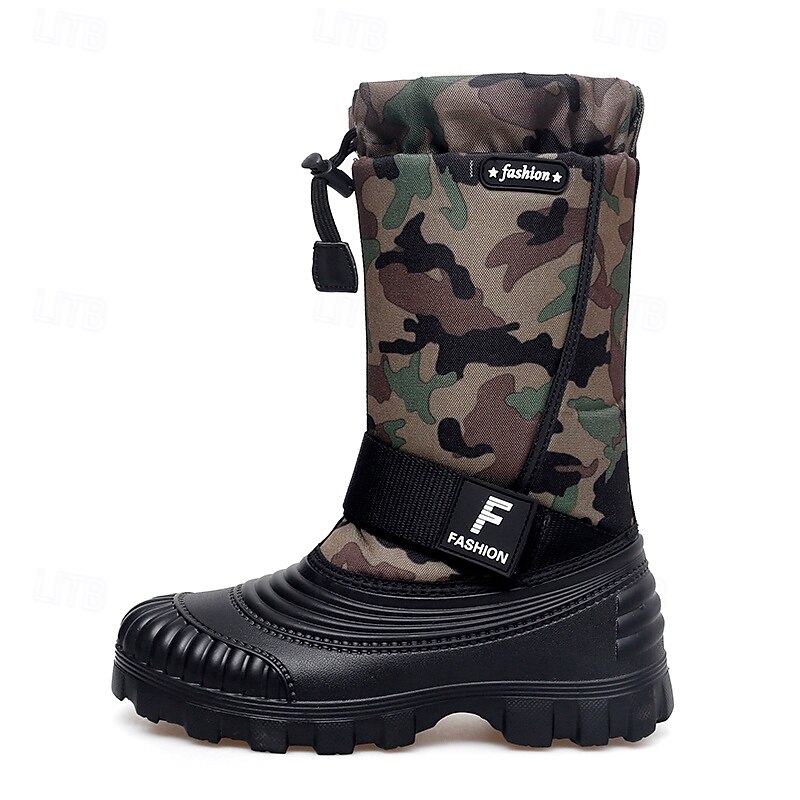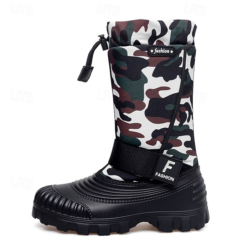 : Featuring a striking camouflage pattern, these boots seamlessly combine fashion with functionality. The non-slip rubber outsole offers excellent traction on wet or icy surfaces, making them a safe option for outdoor activities. The drawstring closure prevents snow and cold air from entering the boots, enhancing their protective capabilities.