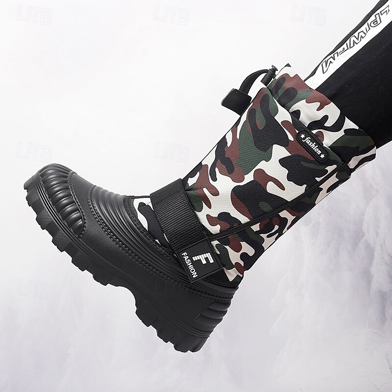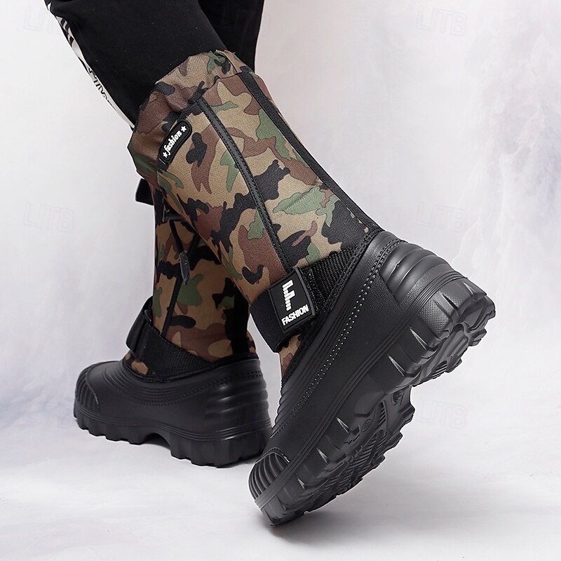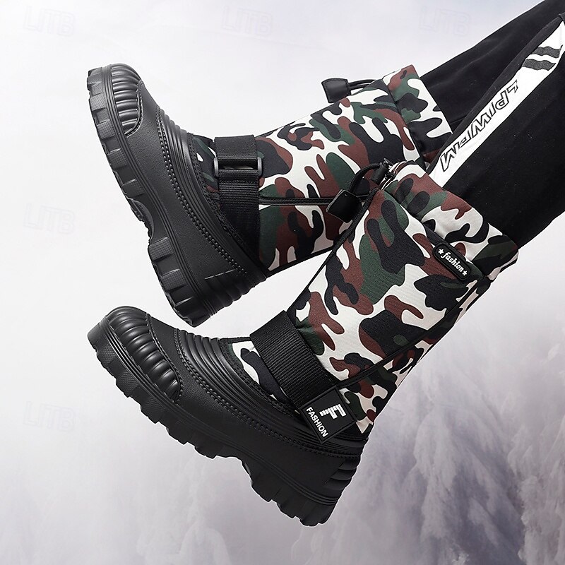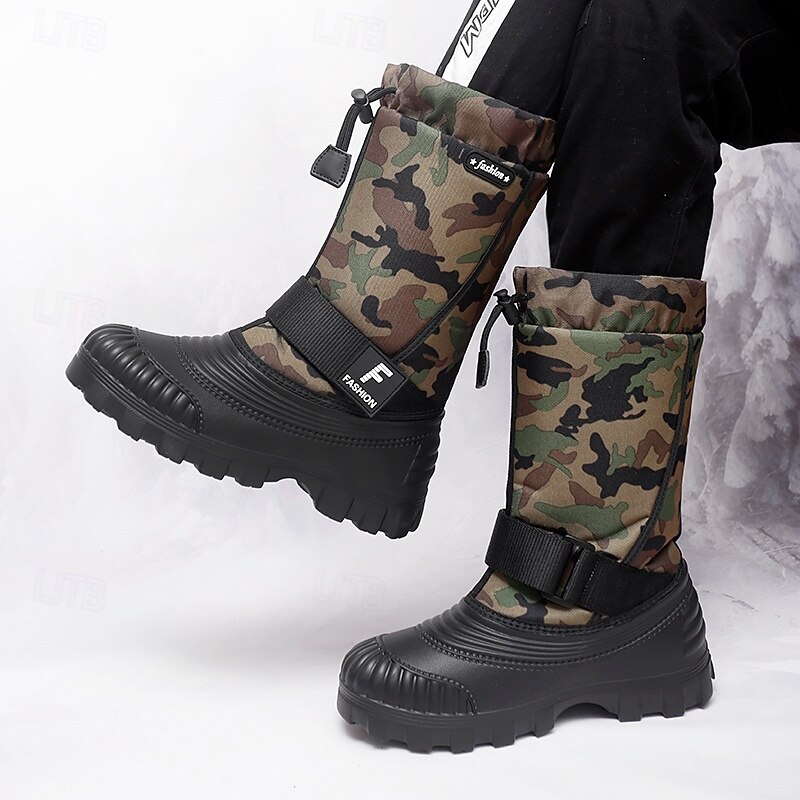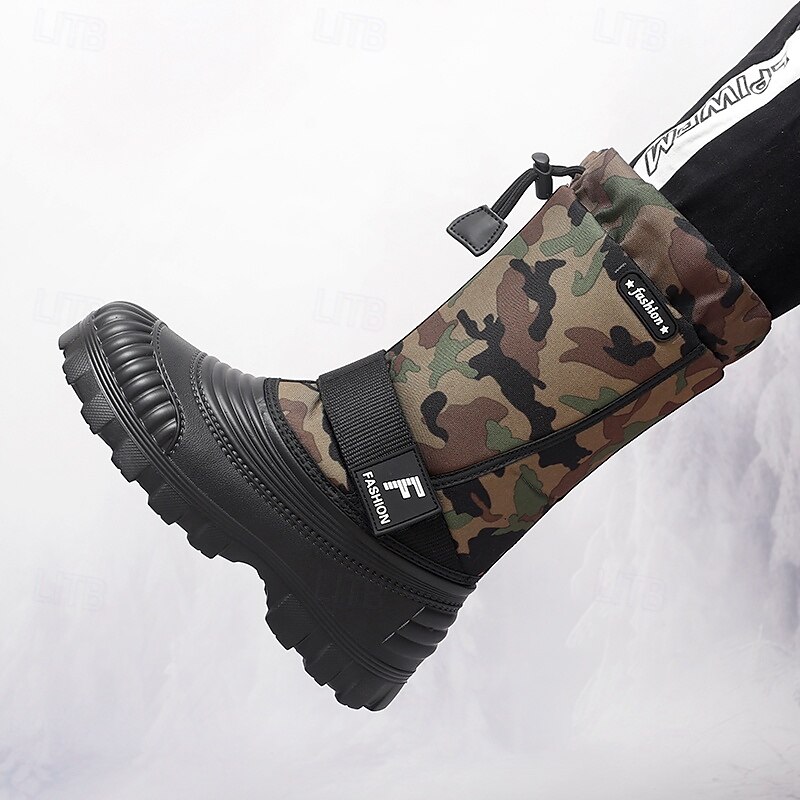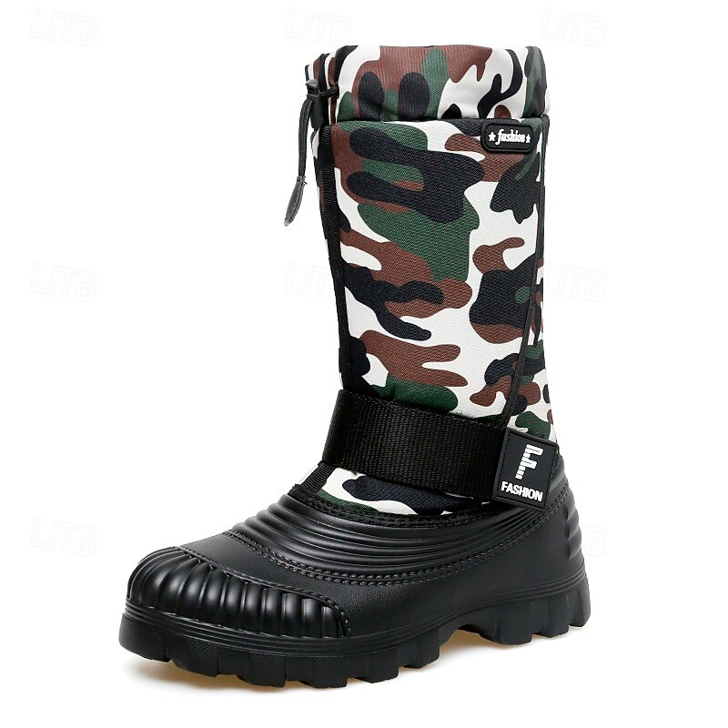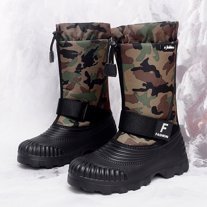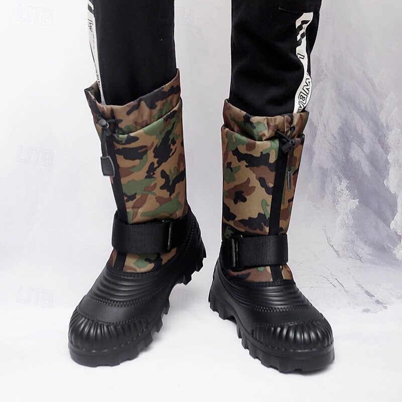 : Featuring a striking camouflage pattern, these boots seamlessly combine fashion with functionality. The non-slip rubber outsole offers excellent traction on wet or icy surfaces, making them a safe option for outdoor activities. The drawstring closure prevents snow and cold air from entering the boots, enhancing their protective capabilities.