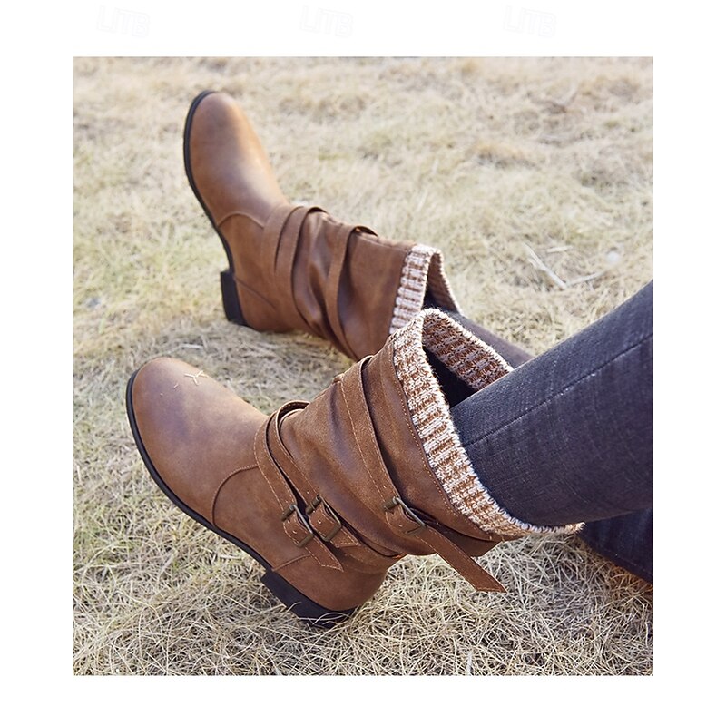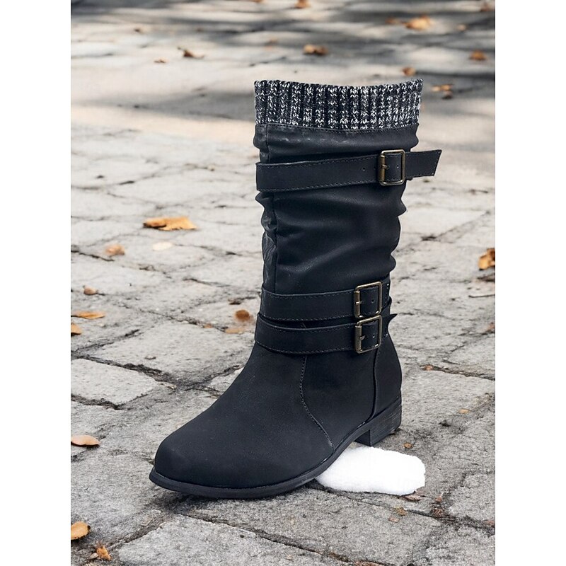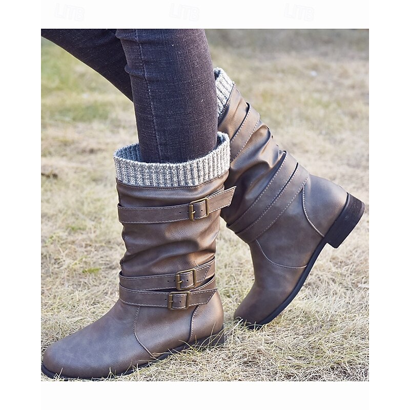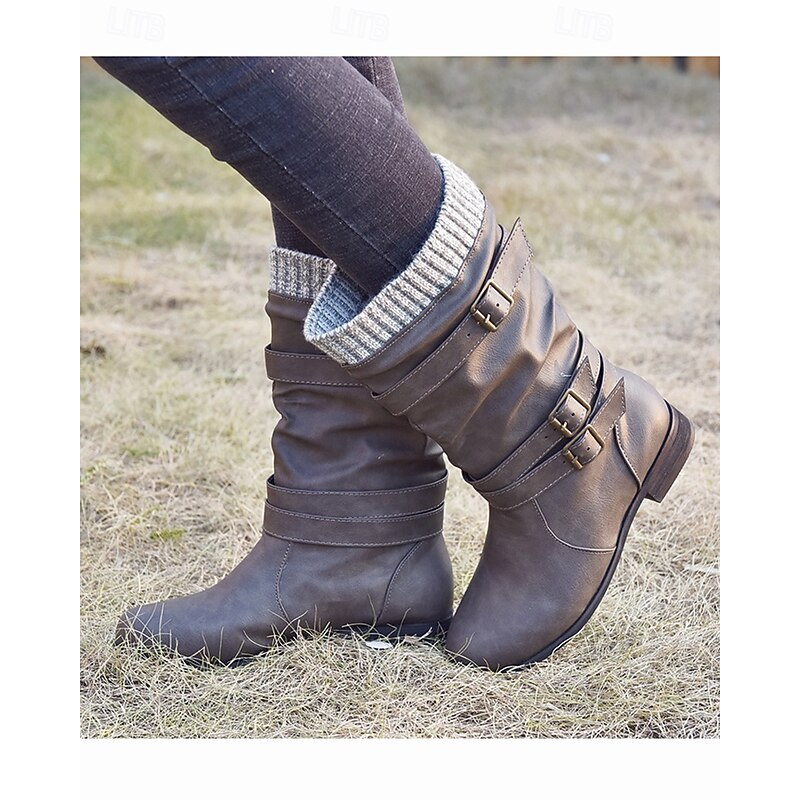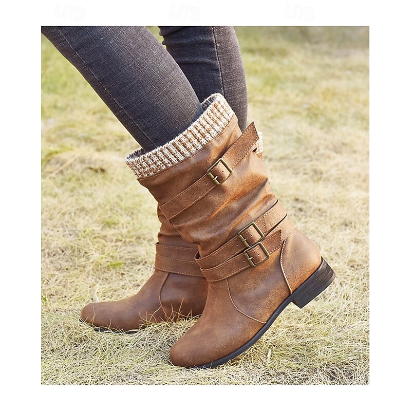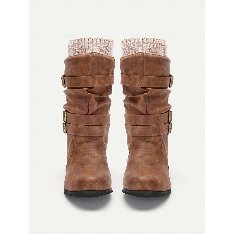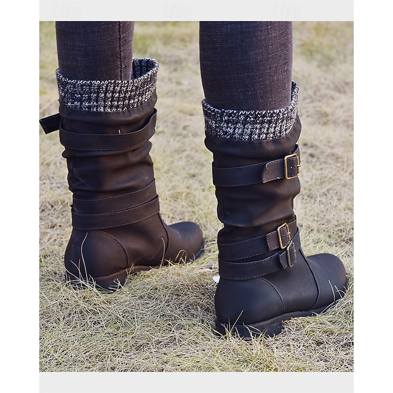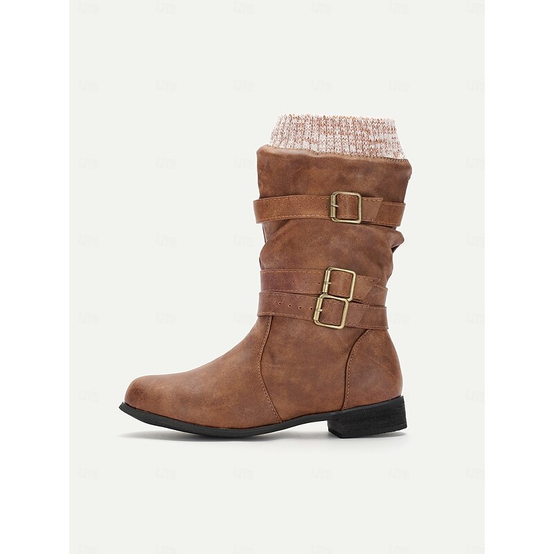 Highlights [Fabric] : Crafted from premium PU and elastic fabric, these women's mid-calf boots feature a rustic faux leather exterior for a timeless and sophisticated look. The interior is lined with textile material, providing a warm and cozy fit ideal for the cooler months of spring, fall, and winter. [Fit] : The boots boast a cozy round toe shape, ensuring an all-day wear experience without compromising style. The mid-calf design provides ample coverage and support, making them a versatile choice for any wardrobe. [Design Highlights] : These boots are adorned with chic double buckle straps, offering a touch of sophistication and allowing for adjustability to fit your personal style. The knit cuff adds a cozy charm to the overall rustic appeal. The sturdy chunky heel provides stability, while the loafer closure ensures an easy and snug fit. [Occasions] : Perfect for daily wear or work, these boots seamlessly blend fashion with practicality. Pair them with jeans or skirts for a casual yet refined outfit. Their timeless appeal makes them an excellent choice for a variety of occasions, from everyday errands to leisurely outings. [Size Suggestion] : Available in a wide range of sizes from US5.5 to US10.5, these boots are true to size, making it easy to select your usual size for an optimal fit. Perfect for everyday use. first-class materials and excellent craftsmanship ensure long-lasting durability.